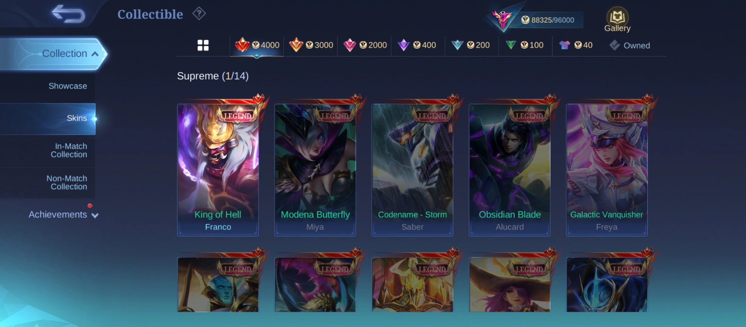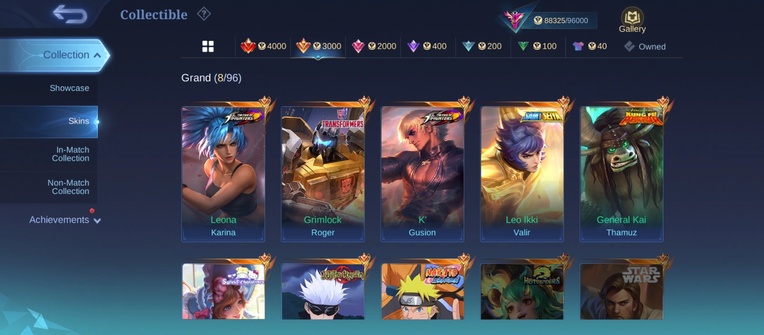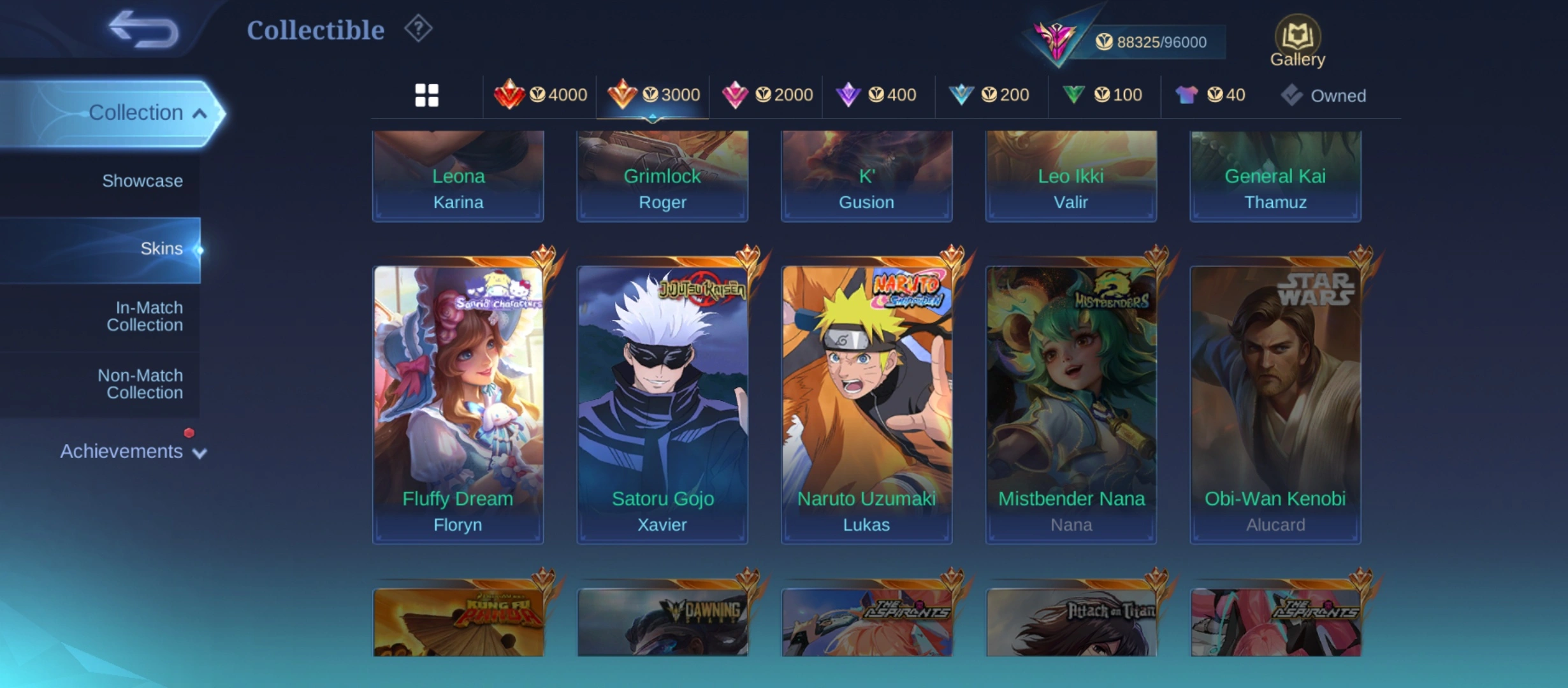 GG885|Lvl 57|EXALTED CC 4|74% HIGH WR|271 SKIN|ALL EMBLEM MAX|FRANCO LEGEND|GOJO XAVIER JJK|GUSION KOF|VALIR GOLD SAINTSEIYA|NARUTO UZUMAKI|FLORYN SANRIO