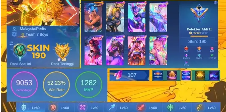 ML272 /190 skins and holds the Kolektor Ahli II title. Total matches are 9053 with a 52.23% Win Rate and 1282 MVP awards (G)