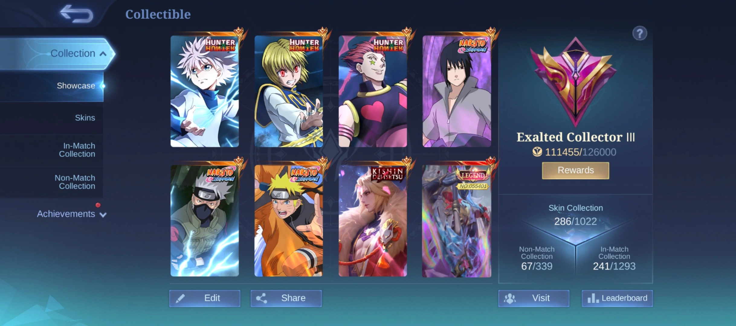 N263|LV 76|EXALTED COLLECTOR III|286 SKIN|2 LEGEND (ALPHA,FRANCO)MOSKOV INFERNAL|LANCE KINSHIN|3 NARUTO|3 HUNTERXHUNTER|2 KOF|CLAUDE PRIME