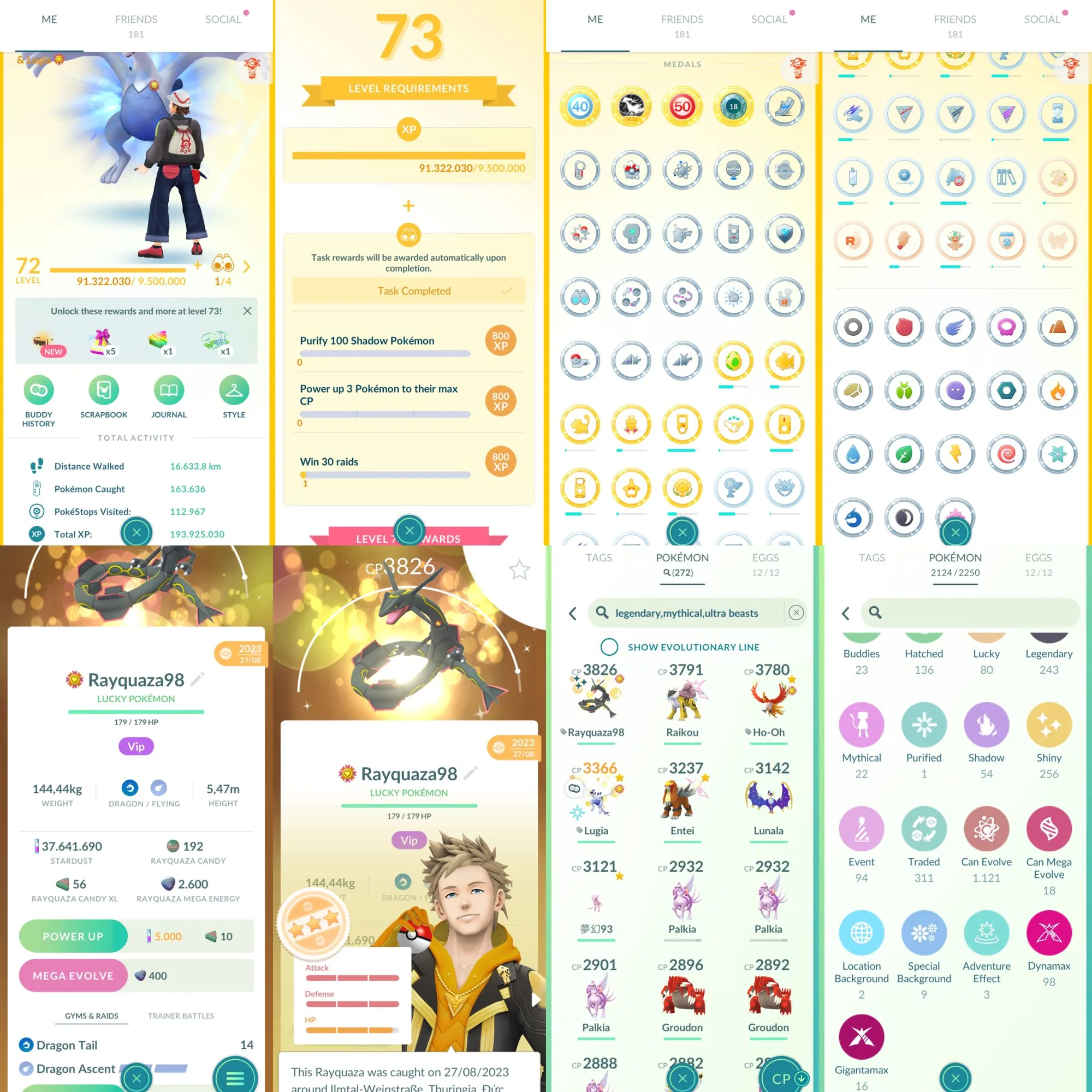 Beasts Old 2016-Level 72+;3 Legend iv100;Lugia Apex lucky;Mega Shiny Rayquaza;259 legend;256 shiny;319 Hundo;37 mil+ Stardust;80 Shundo;94 Costume;74 Lucky;91 Dynamax