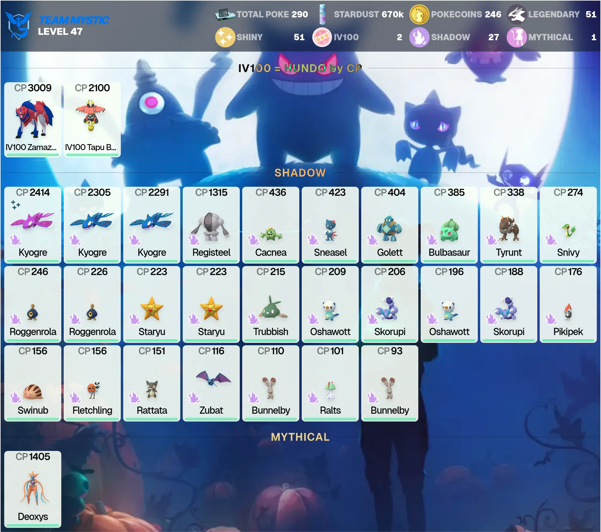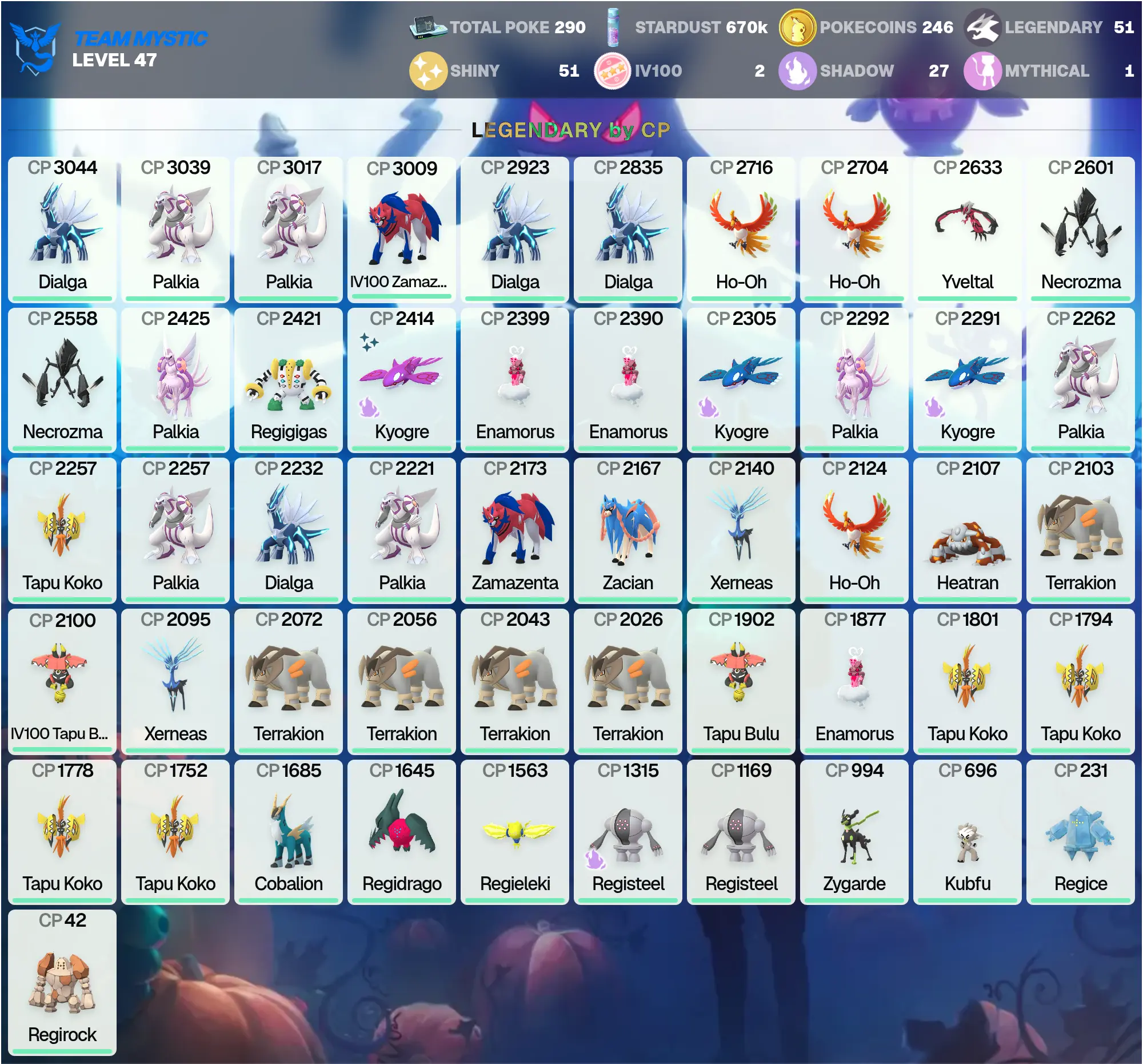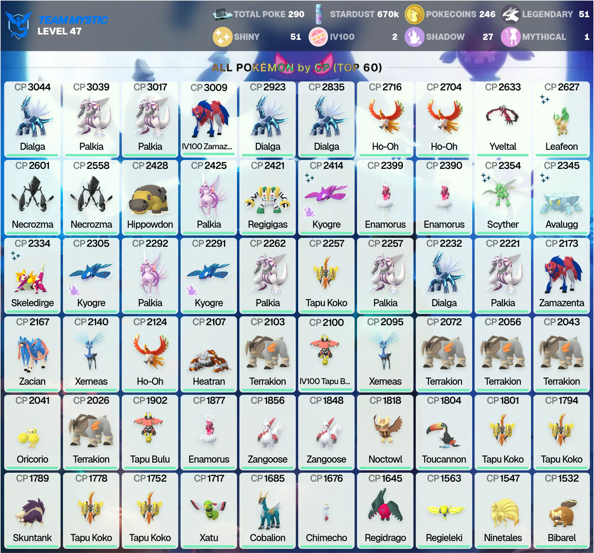 👑 POGO 🏆 Dialga 3K ⏳ | IV100 Zamazenta 3K 🛡️ | Shiny Kyogre 🌊 | Necrozma 🌌 | IV100 Tapu Bulu 🌺 | Shiny: 51 ✨ | 2 Palkia 3K 🌊 | Terrakion ⚔️ | Ho-Oh 🌅 | PG-WWFRD | [MG] !MKG016342