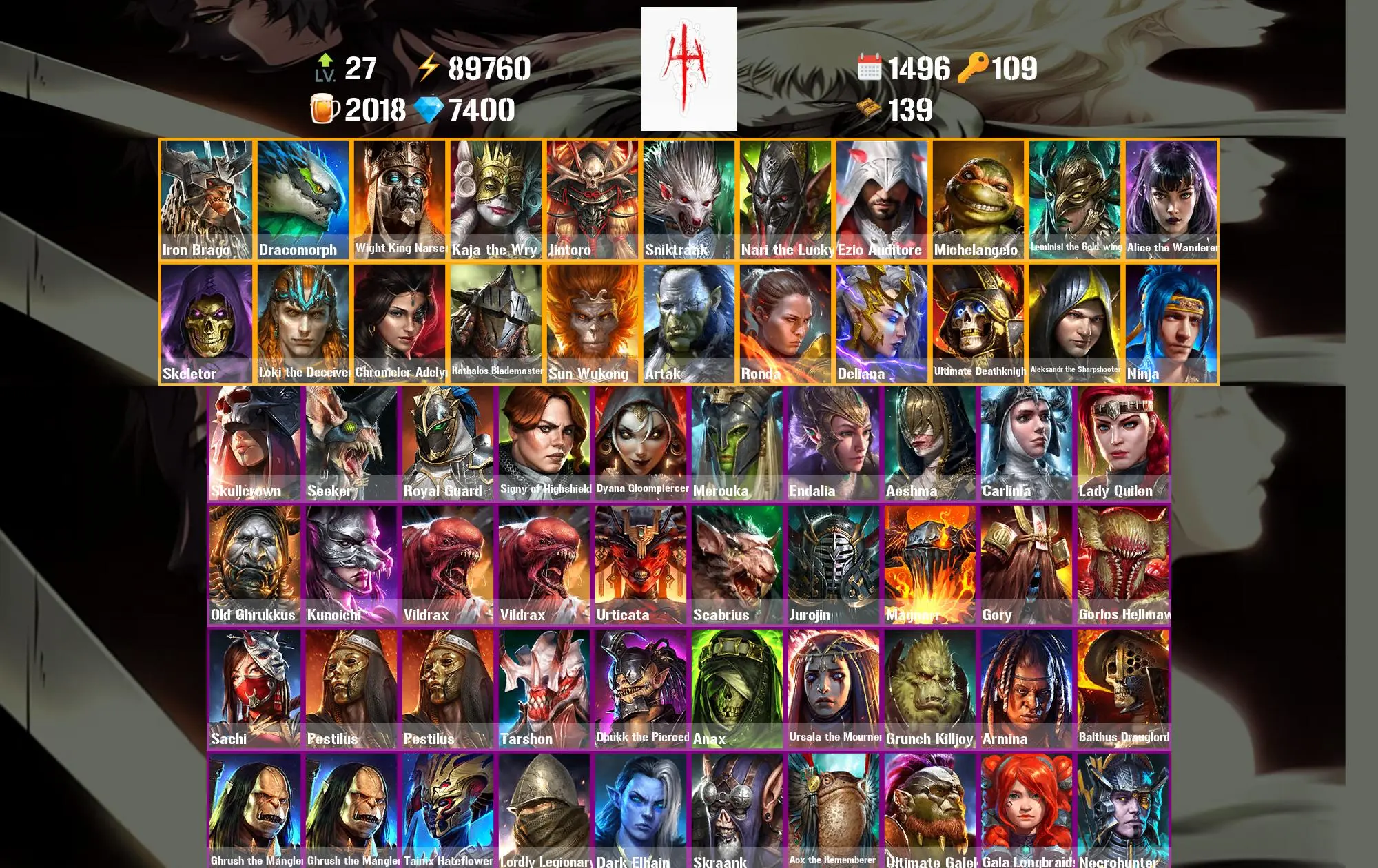 1496 Days 89.8k Energy Iron Brago ⸱ Dracomorph ⸱ Wight King Narses ⸱ Kaja the Wry ⸱ Jintoro ⸱ Skullcrown ⸱ Seeker ⸱ 61.9m Silver ⸱ 7.4k Gems