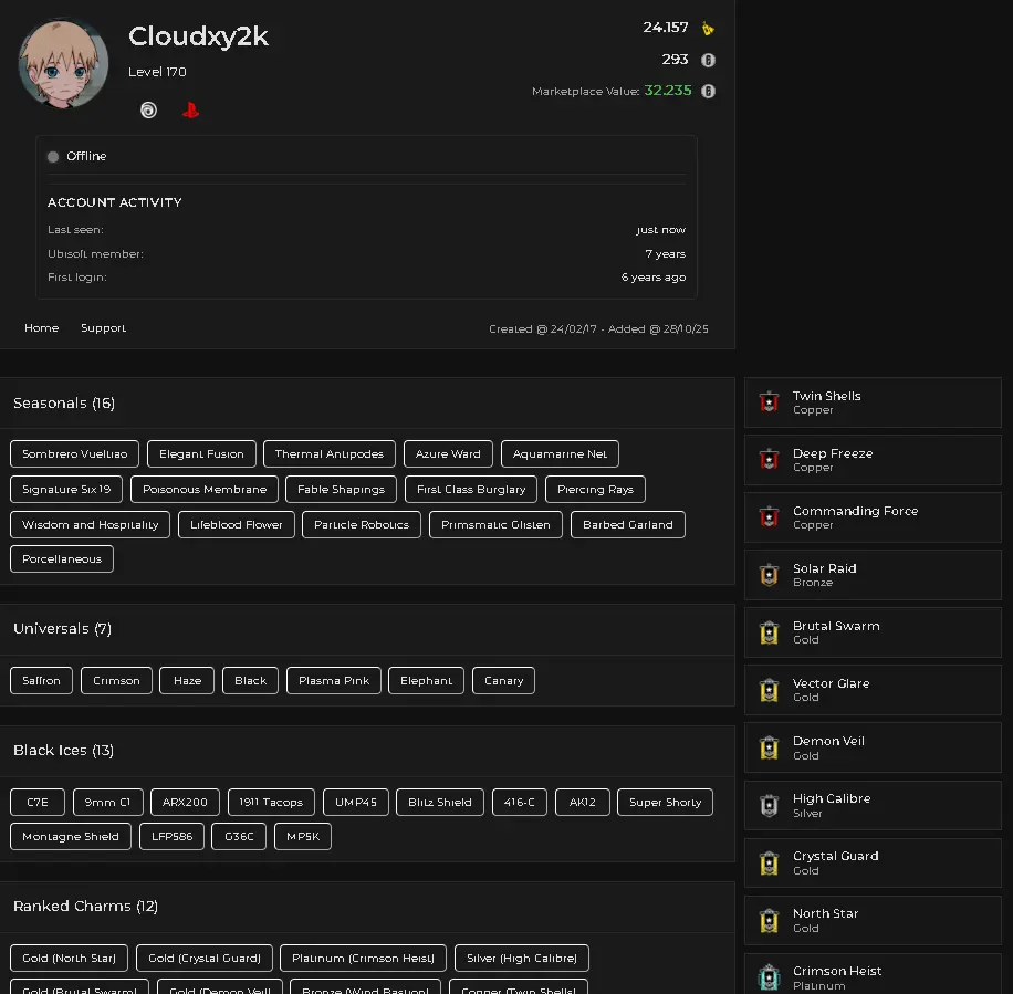 ⭐[XBOX LINKABLE]⭐Level 170✅X1 Platinum🎨7 Universal Skin🌸16 Seasonals Skin❄️13 Black Ice👑72 Operators🔥344 Weapon Skin⚜️2 Elite💫24K Renown