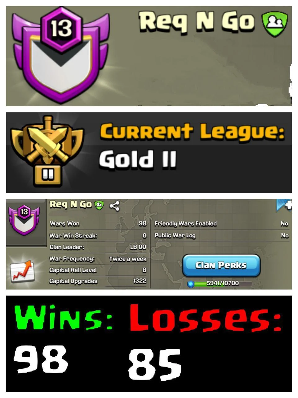 ❤🔥OP LEVEL 13 ENGLISH CLAN ✨ OP NAME : Req N Go💥 LEAUGE : GOLD 2♨️ CLAN CAPITAL : 8 ⭐ WINS : 98 | LOSS : 85 ❣️BEST CLAN BUY NOW ⚡ FAST DELIVERY🚚