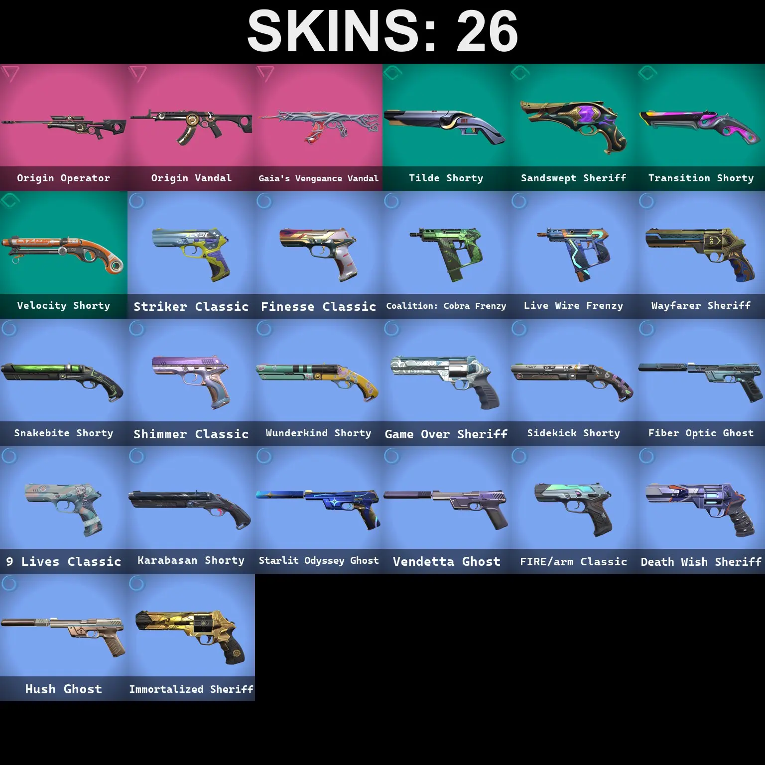 26 SKINS | ORIGIN VANDAL | ORIGIN OPERATOR | COALITION: COBRA FRENZY | TRANSITION SHORTY | GAIA'S VENGEANCE VANDAL | SANDSWEPT SHERIFF | WAYFARER SHERIFF | GAME OVER SHERIFF | DEATH WISH SHERIFF | IMMORTALIZED SHERIFF | FIBER OPTI