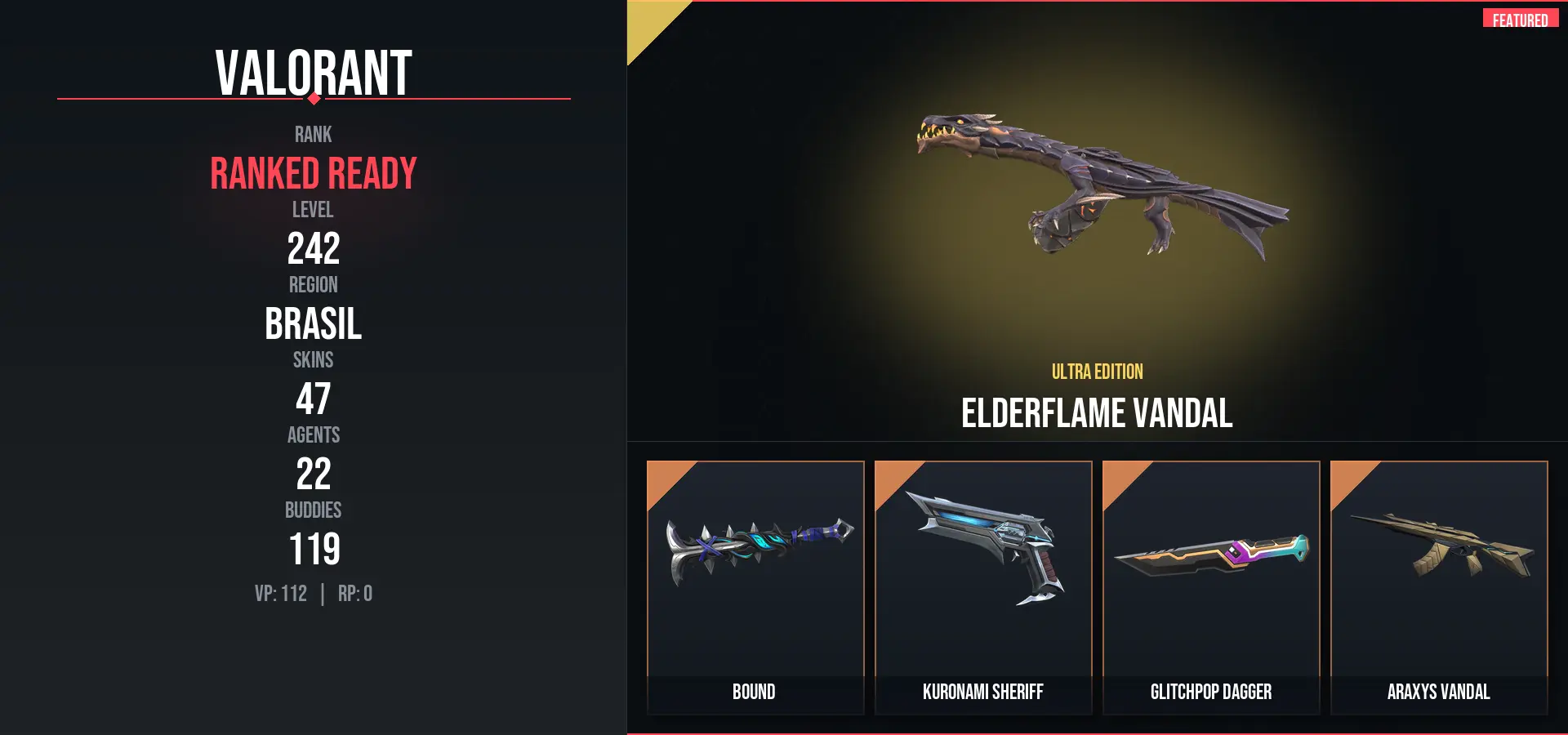 47 Skins / 22825 VP SPENT / Glitchpop Dagger / Elderflame Vandal / Kuronami Sheriff / Prime Vandal / Reaver Vandal / Araxys Vandal / Magepunk Sparkswitch / Origin Operator