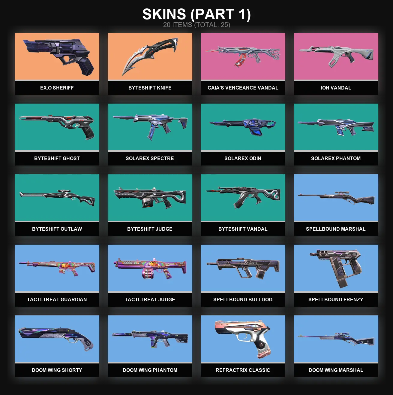 EU | 25 skins 🐓 Byteshift Knife 🐓 Ion Vandal 🐓 Gaia's Vengeance Vandal 🐓 EX.O Sheriff 🐓 Byteshift Ghost 🐓 Solarex Spectre 🐓 Solarex Odin 🐓 Solarex Phantom 🐓 Byteshift Outlaw 🐓 Byteshift Judge 🐓 Byteshift Vandal 🐓 Spellbound Marshal 🐓 G3359