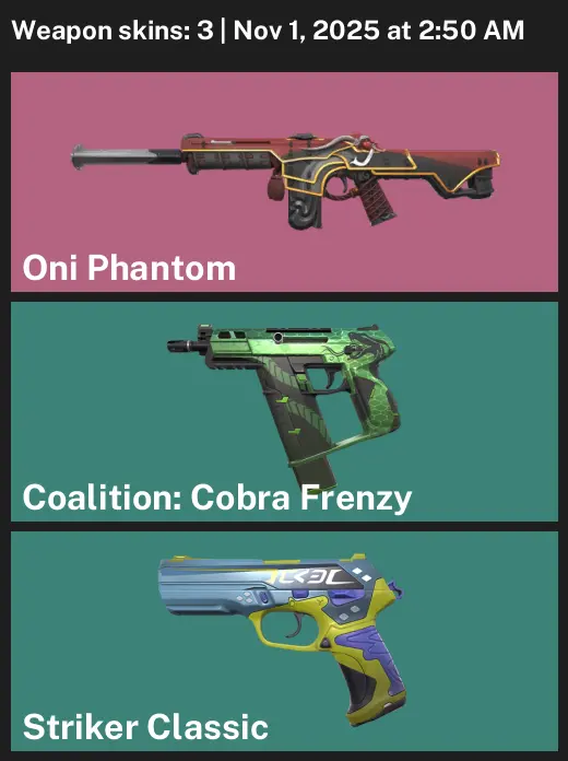 🥐 EU 📥 Unranked 🥿 3 Skins 🧀 75 VP 🫡 13 Agents 🤼♀️ Value: 1775 VP 🐿 Oni Phantom 🔓 Coalition: Cobra Frenzy 🚅 Striker Classic