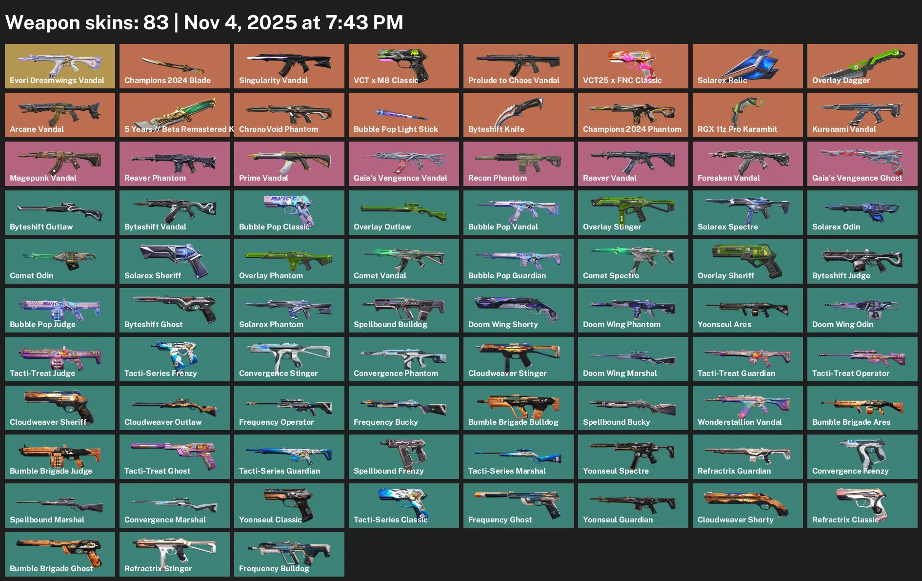 🛫 EU 🧮 Unranked 🦽 83 Skins 🪙 327 VP 🥛 22 Agents 🎾 Value: 41000 VP ⛴ Evori Dreamwings Vandal 🚤 Champions 2024 Blade 💦 Singularity Vandal 🗜 VCT x M8 Classic 🥣 Prelude to Chaos Vandal 🪠 VCT25 x FNC Classic