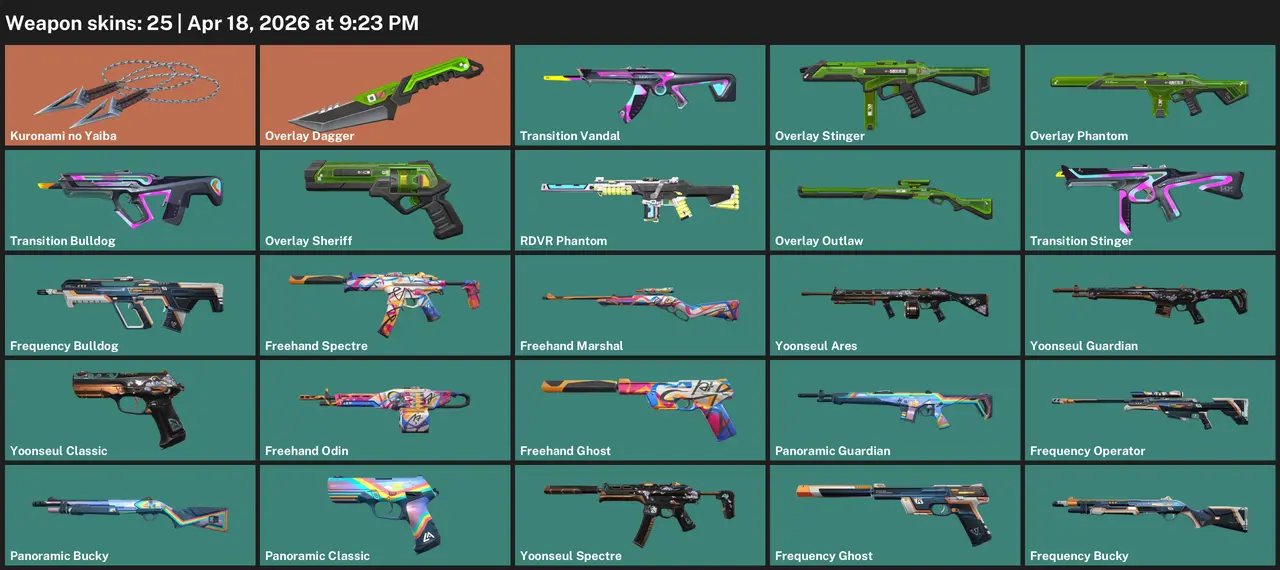[NA] 🔥 | 25 Skins • Kuronami no Yaiba + Overlay Dagger + RDVR Phantom + Transition Vandal • ≈5,350 VP Inventory Value • Full Access