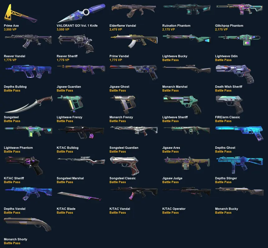 VA2580 EU Prime Axe | VALORANT GO! Vol. 1 Knife | Elderflame Vandal | Ruination Phantom | Glitchpop Phantom | Reaver Vandal | Reaver Sheriff | Prime Vandal