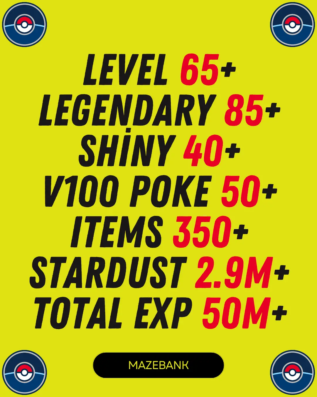 LEVEL 65+ ⭐️ 85+ Legendary ⭐️ 50+ Hundo ( IV100 )⭐️ 40+ Shiny ⭐️ 350+ Items ⭐️ 2.9M+ Dust ⭐️ 200+ Pokemon ⭐️50M+ Exp ⭐️ Random Team ⭐️ Full Access