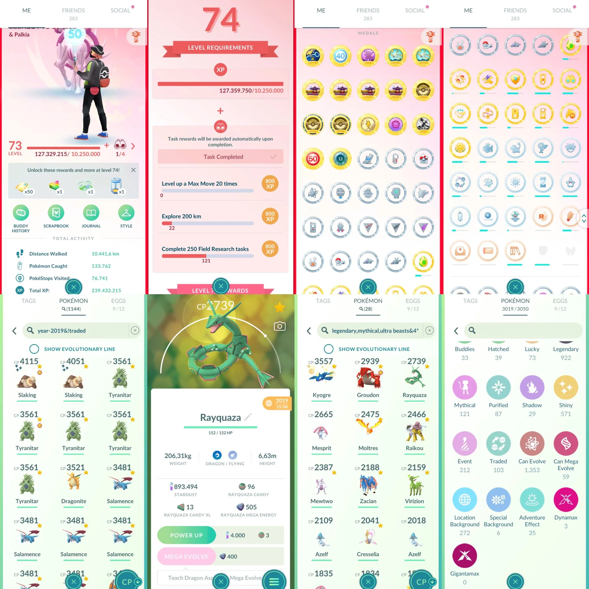 Top Level 73- Old 2018-Level 50; 25 Legend iv100; 1042 Legend; 848 Hundo 4*; 571 Shiny; 1,2 mil+ stardust; 283 location Background; Shiny Fukouka BG; tons old mons