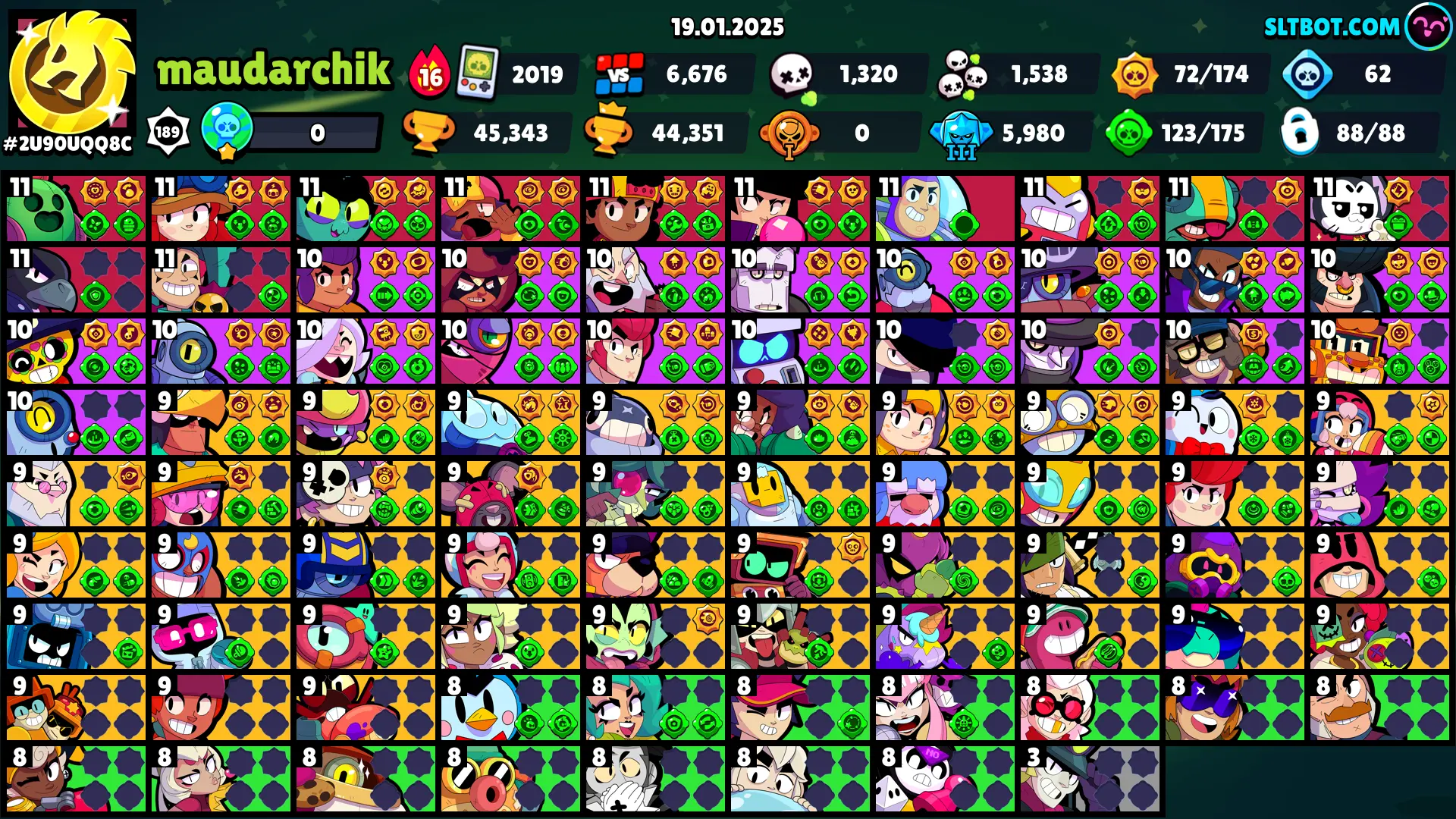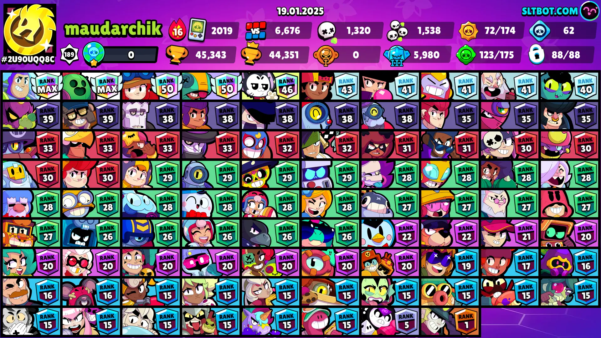 118 SKINS 🩵 44.351 TROPHIES 🏆 87 BRAWLERS 🧸 6 HYPERCHARGED 🩸 11 MAX BRAWLERS 🩷 CAESAR SAM🩵 RED DRAGON JESSIE 🩵 LDU QUITO MIKE 🩵 RICOCHET 🩵 EL REY PRIMO 🩵 SPIKY EVE 🎀