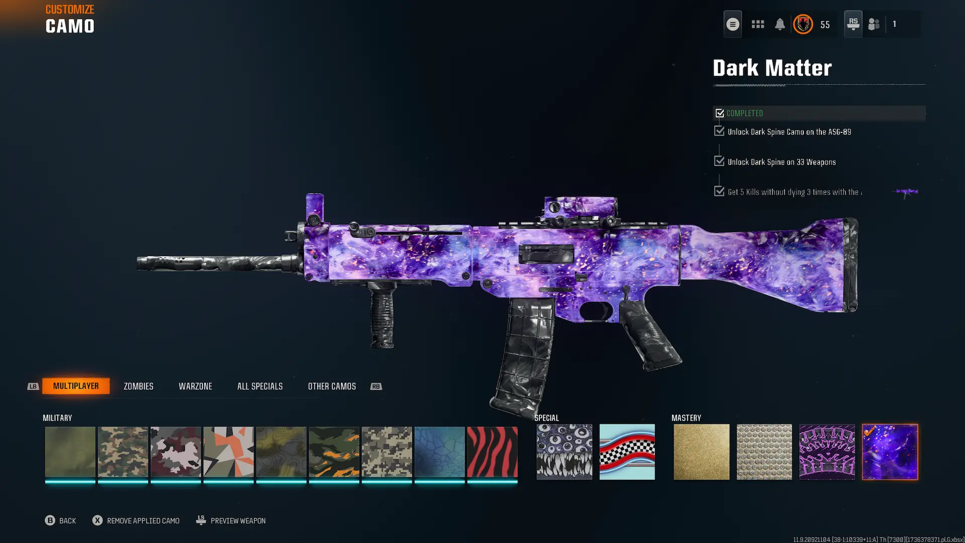✨ BO6 & WZ4 ✨ Dark Matter + Prestige 4 + 50 Wins 💎 495 Camos⚔️ All Multiplayer Camos Are Unlocked on 35 Weapon💎 Level 55 🔥 16 Operators 🕸️ Dark Spine 💎 Diamond✨ Gold Camos 🦾 Prestige-Ready🦾 Linkable to: Steam, Battle.net, PSN, Xbox 🌐 Black Ops 6