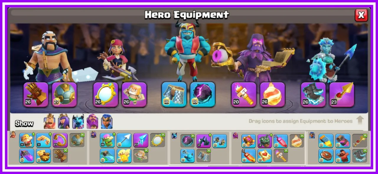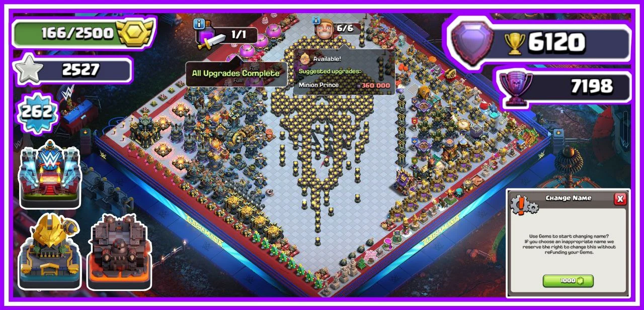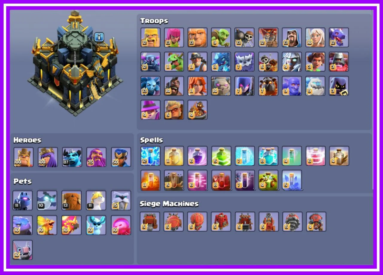 👑 1000% MAXED TH 17 💎 EPIC EQUIPMENTS MAXED 😈 FULLY SUPERCHARGED & PURELY MAXED PROFILE ❄️ 40 HERO SKINS 🔥 3 RARE SCENERIES ✨️ RARE OBSTACLES & STATUES ☃️ DEFENSE OVERVIEW MAXED 🚀 FULL MAX BUILDER BASE 💪 MAGIC ITEMS STACKED ☄️