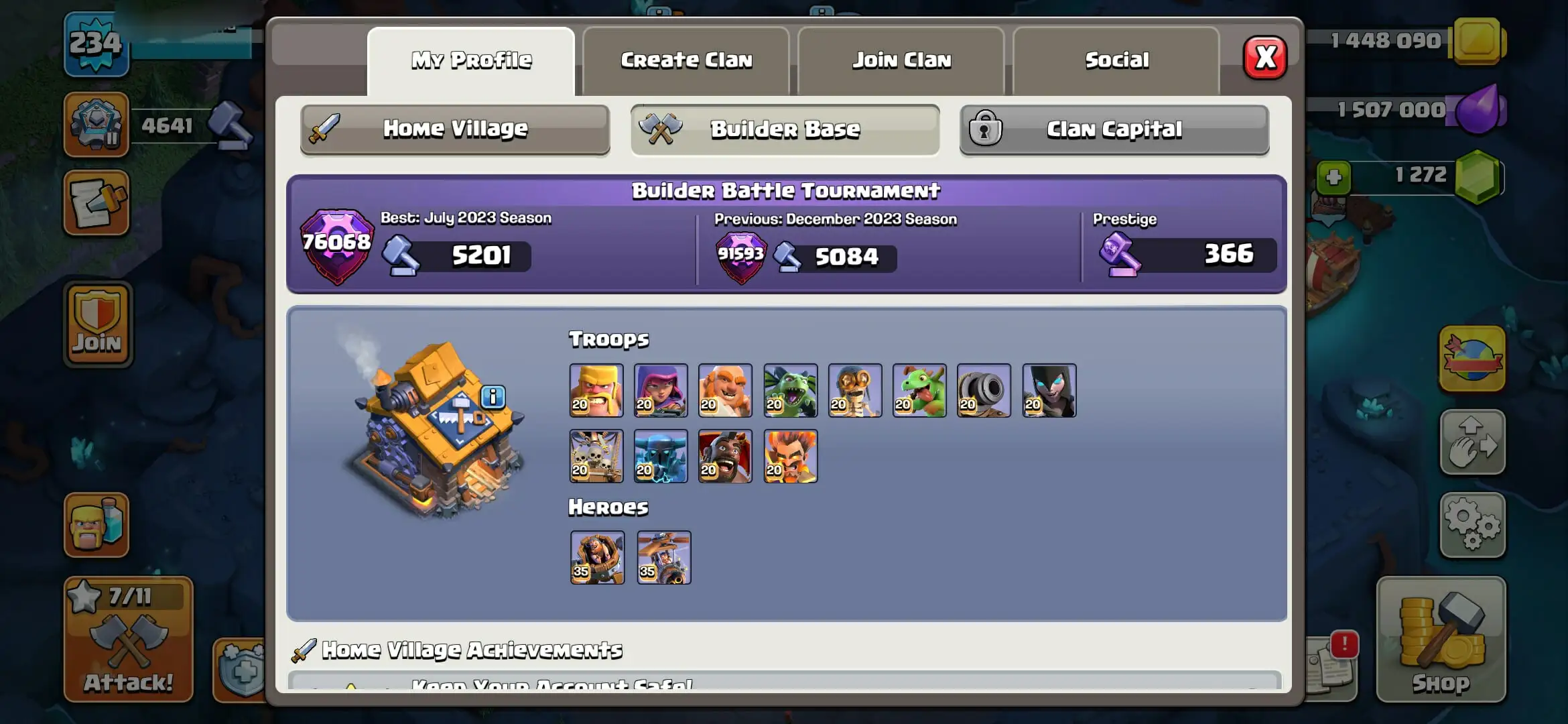 TH 16 Close Max 91/95/70/70/45➤ Builder Base Full max ➤ 1X Premium scenery ➤ Fa+EB Epic Equipment➤ Nc 1k ➤ Fast Delivery (6)