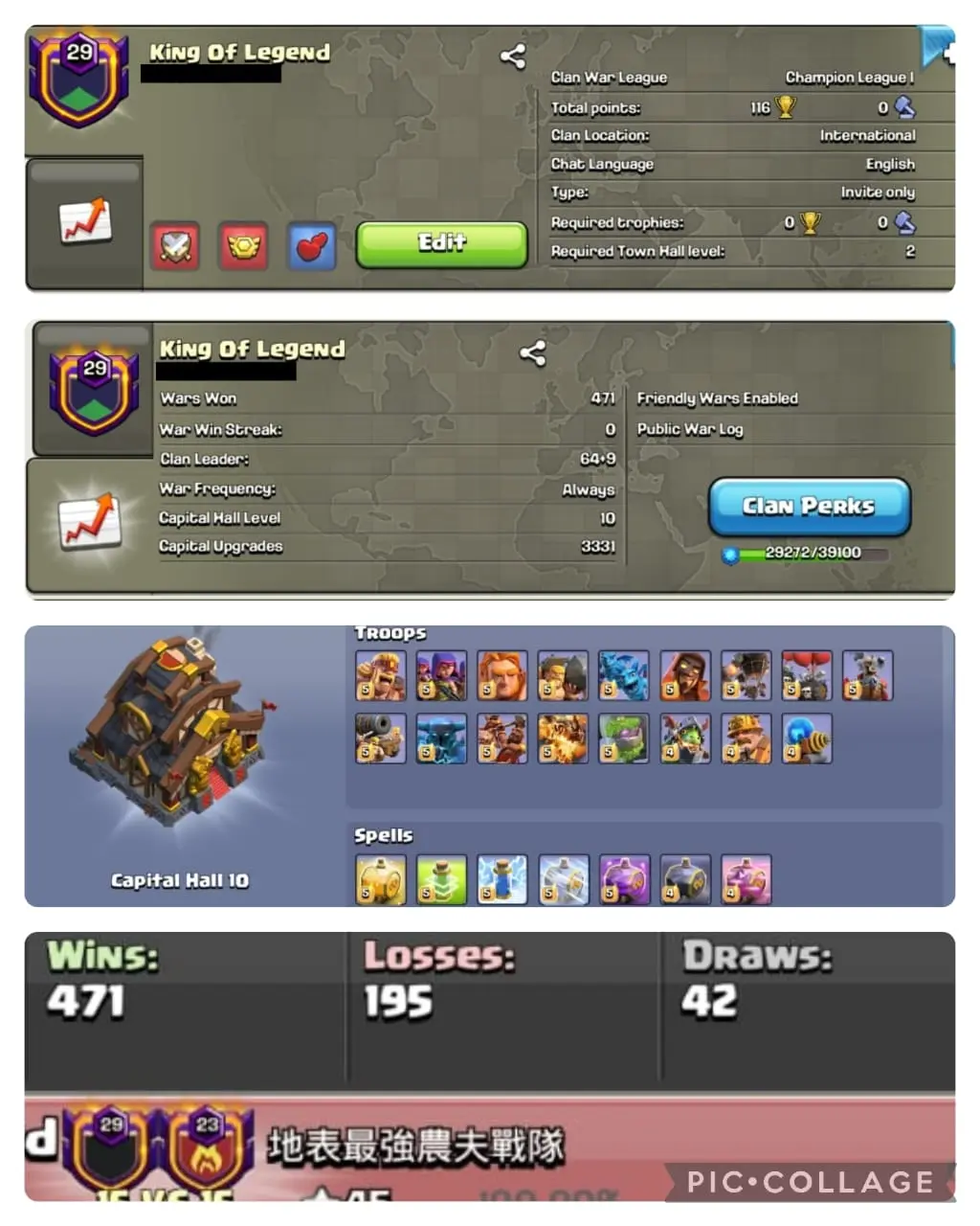 ✨[29 LVL RARE ] 🔥NAME- King Of Legend | 💥LVL- 29.7 |☠️ WARLOG W-L-D: 471-195-42 | CWL LEAGUE : Champion 1🏆 | CC: 10 MAX !!⚡⚡