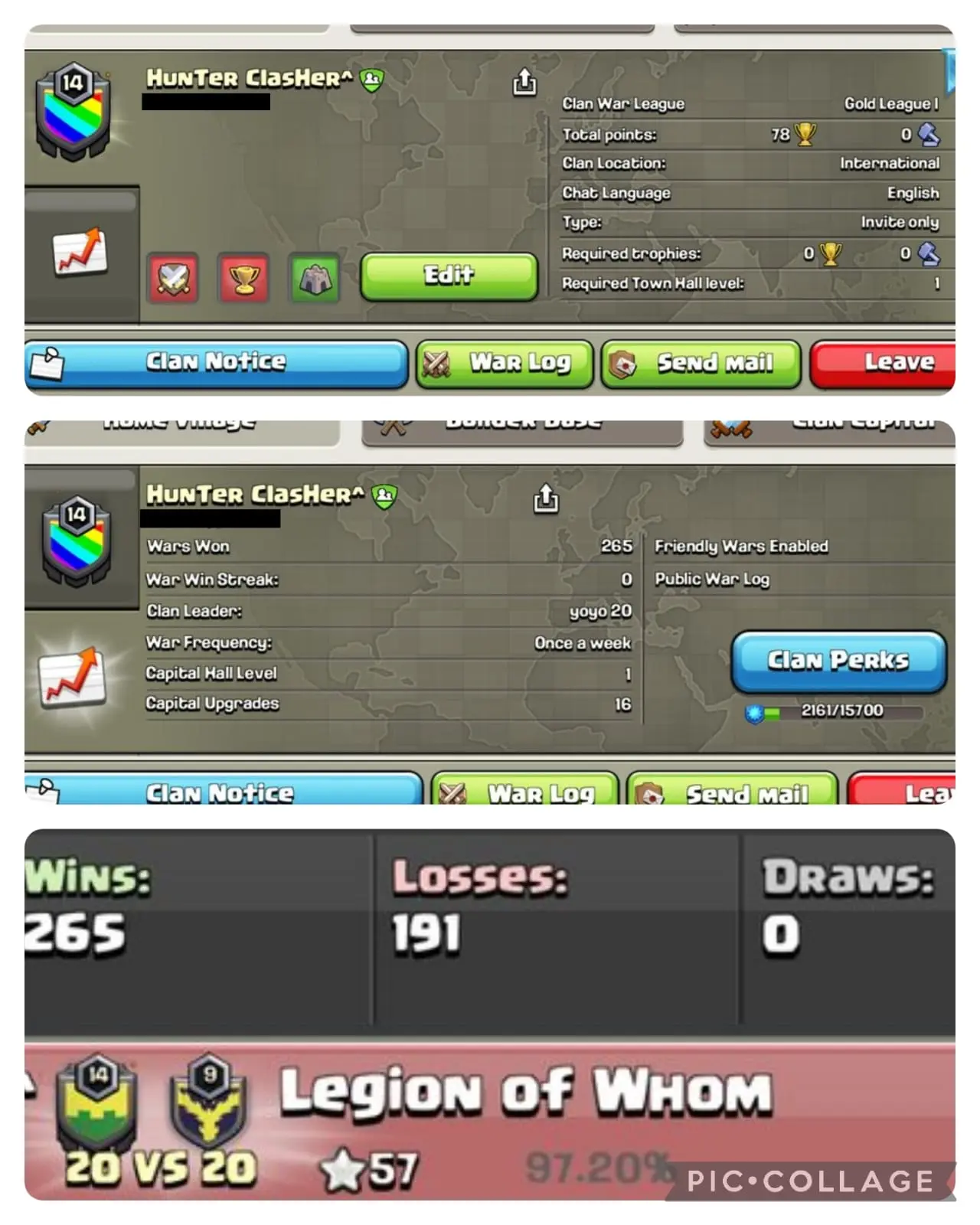🔥NAME- HunTer ClasHer^ | 💥LVL- 14 |☠️ WARLOG W-L-D: 265-191-0 | CWL LEAGUE : GOLD 1🏆