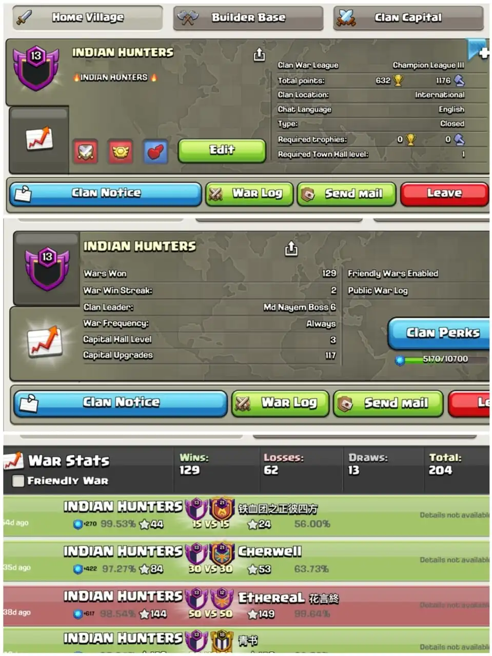 🫡[ CHAMP 3]🔥NAME- INDIAN HUNTERS | 💥LVL- 13 |☠️ WARLOG W-L-D: 129-62-13 | CC: AMOST 4 !!⚡⚡