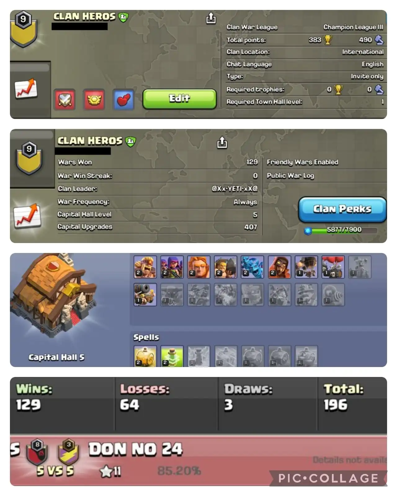 🔥NAME- CLAN HEROS | LVL 9🥵| 💥WARLOG W/L/D:129/64/3| CWL League: CHAMPION 3🏆| CC: ALMOST 6 !!💥