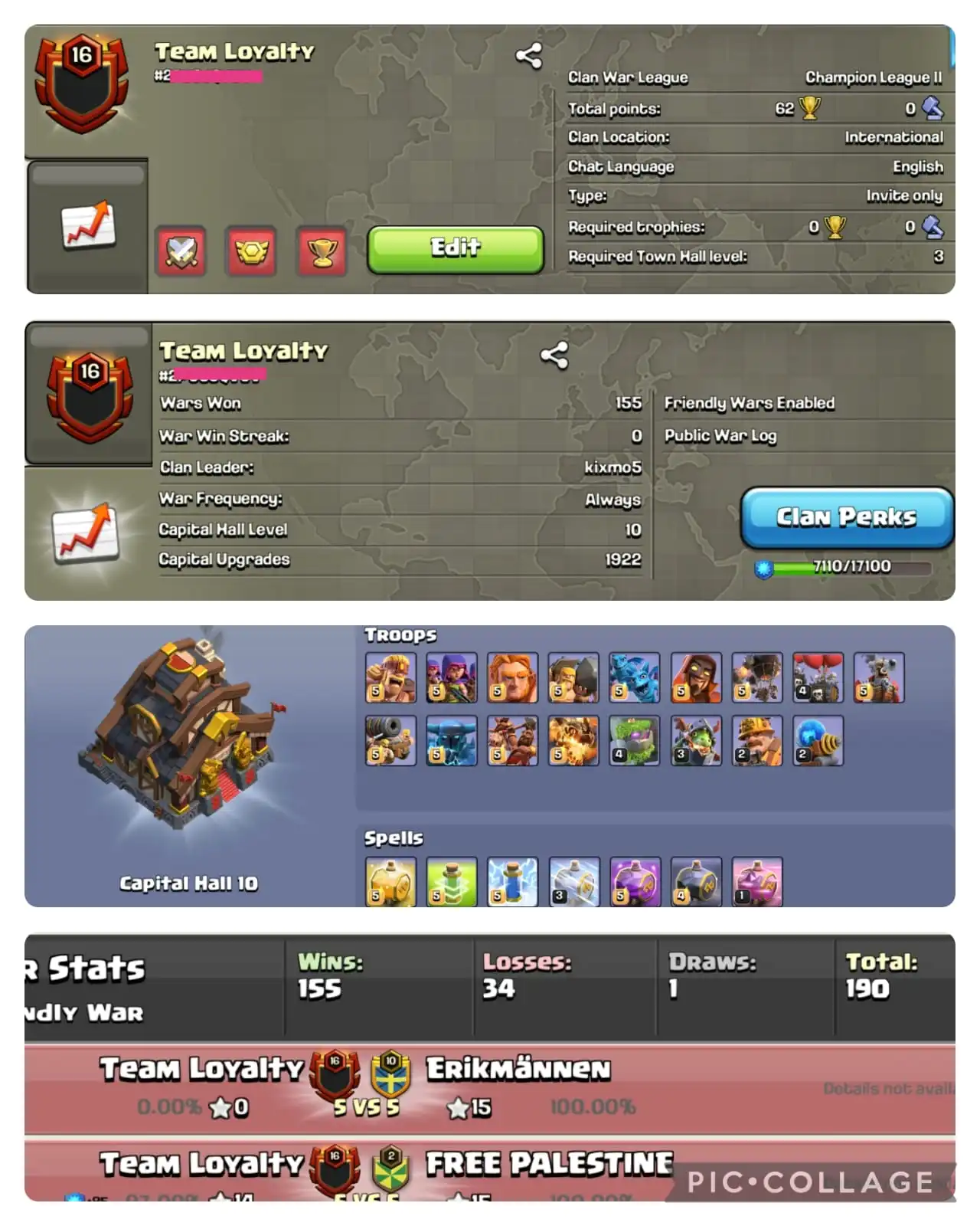 💀[ CHAMP 2+CC 10 ] 🔥 NAME : TEAM LOYALTY 🏆LEVEL - 16.5 🤩WARLOG W-L-D : 156-34-1 ✨