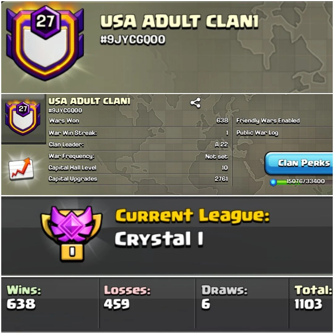 Level 27 | Name - USA ADULT CLAN1 | Clan Capital - 10 | Crystal League | Awesome Warlog | Fast Delivery