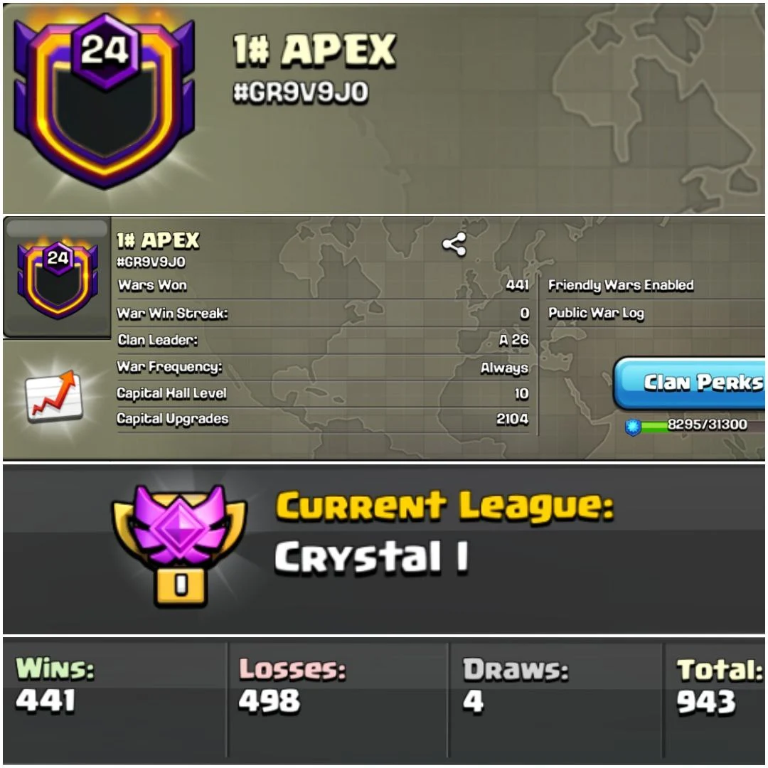 Level 24 | Name - 1# APEX | Clan Capital - 10 | Crystal League | Fast Delivery