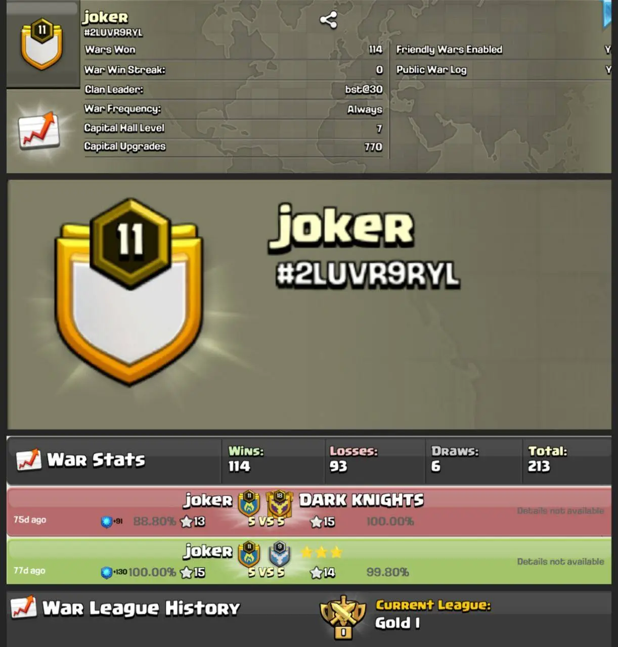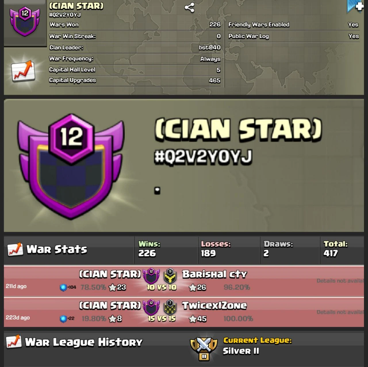 [] NAME:Brother's [] LEVEL:18 [] CAPITAL HALL:5 [] WAR WON: 239 / 89 [] CWL: CRESTAL 1