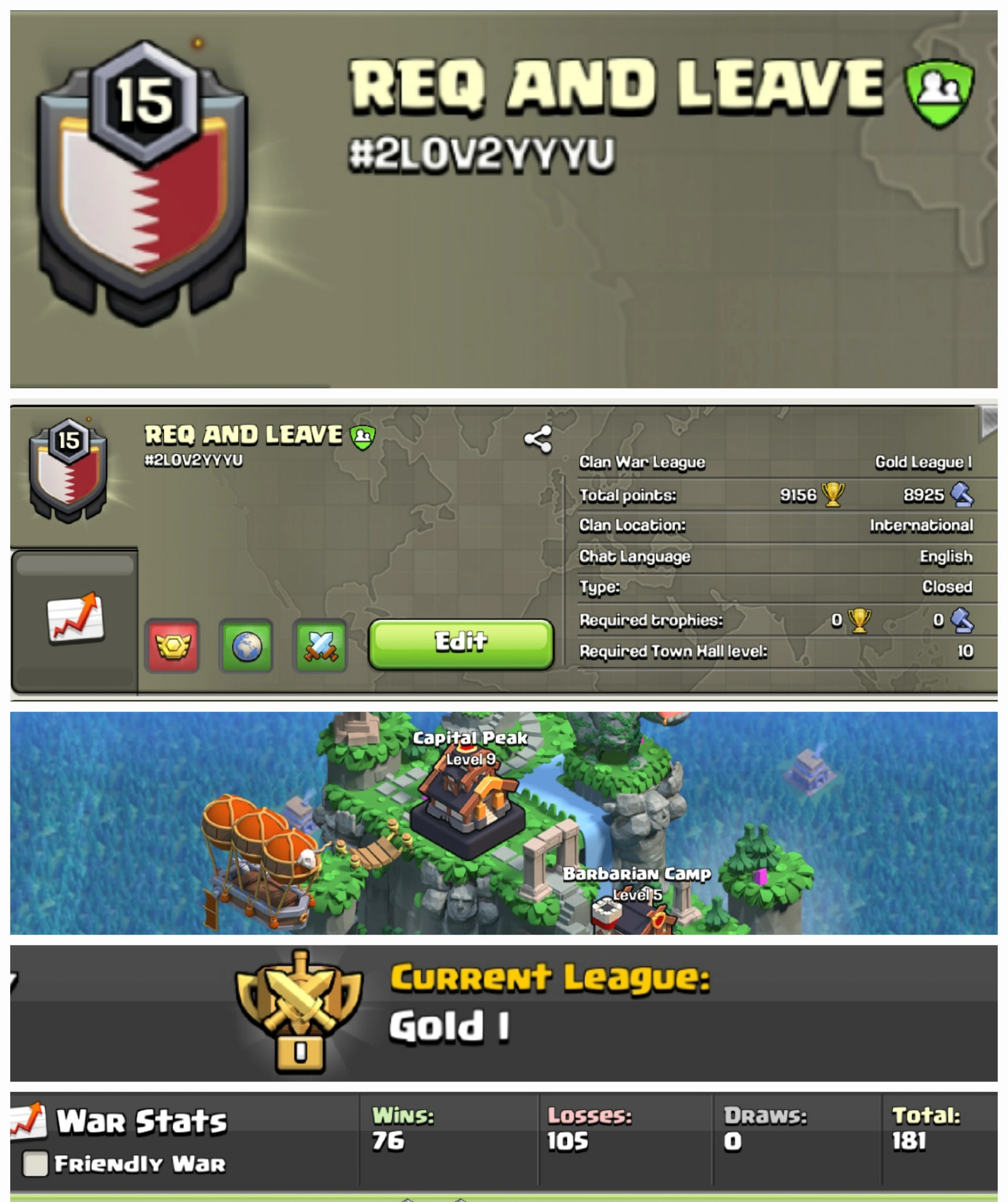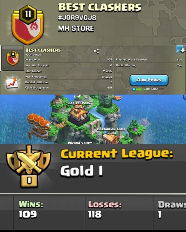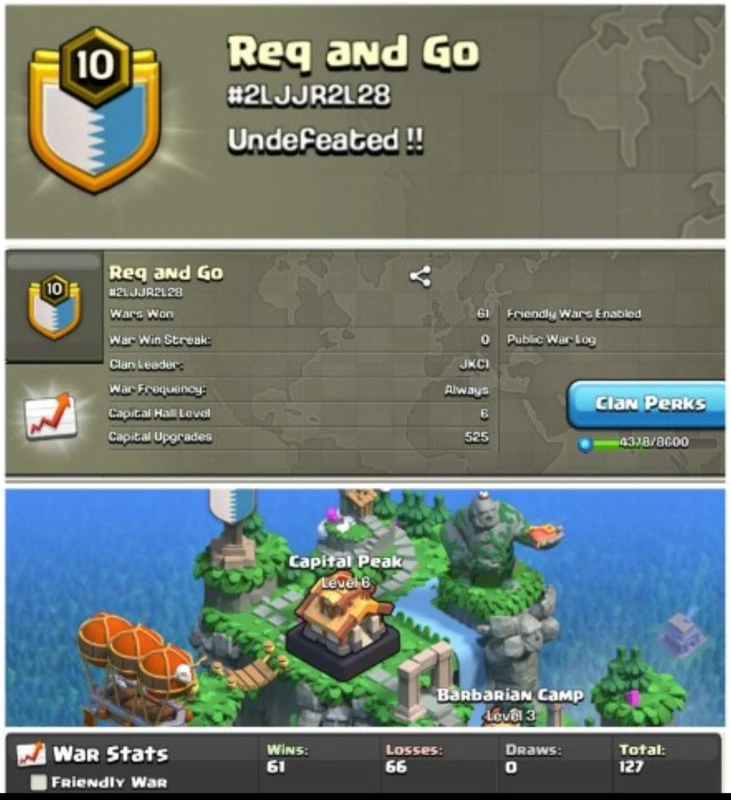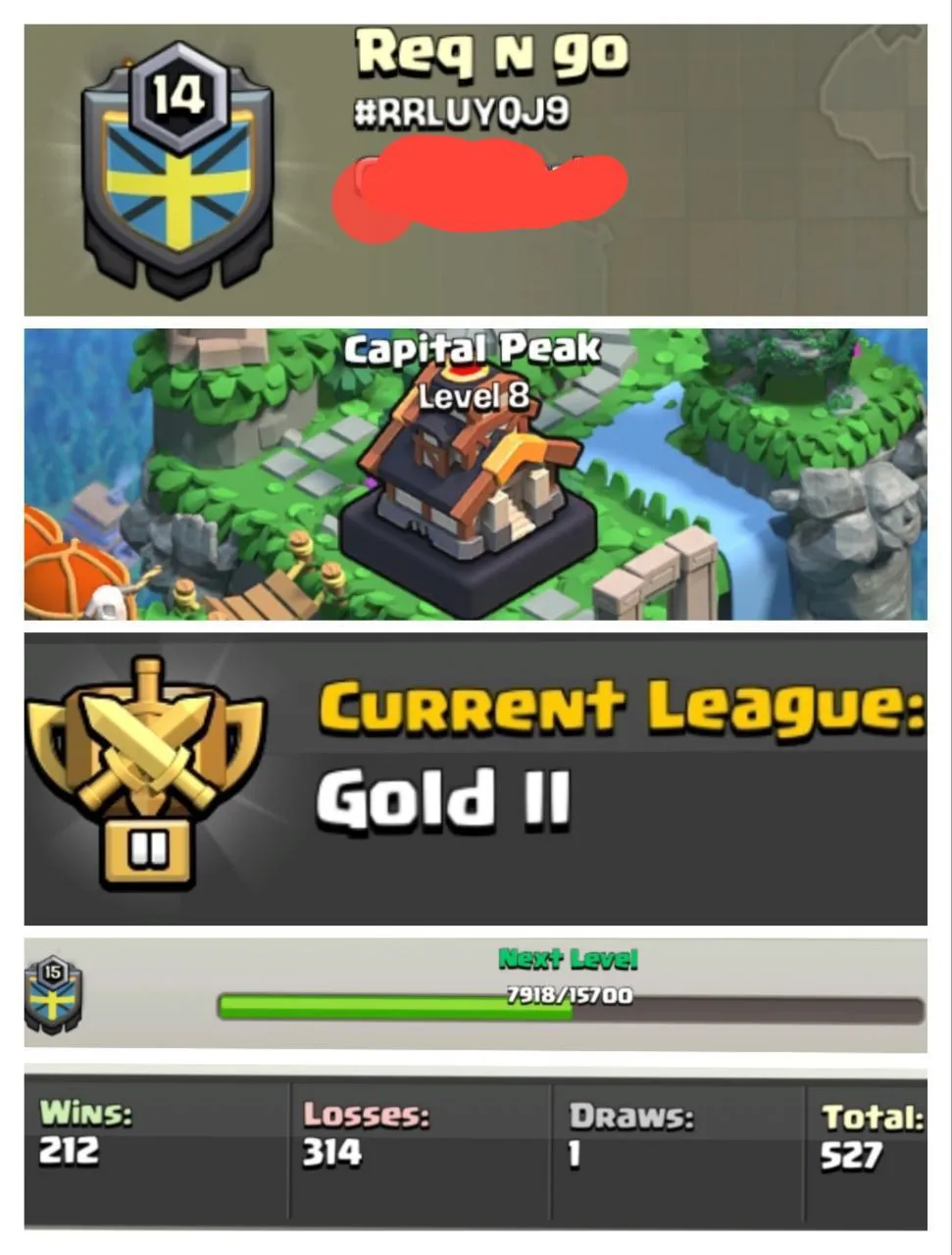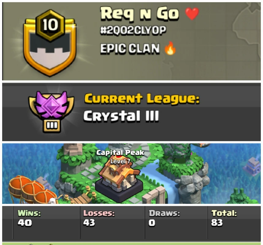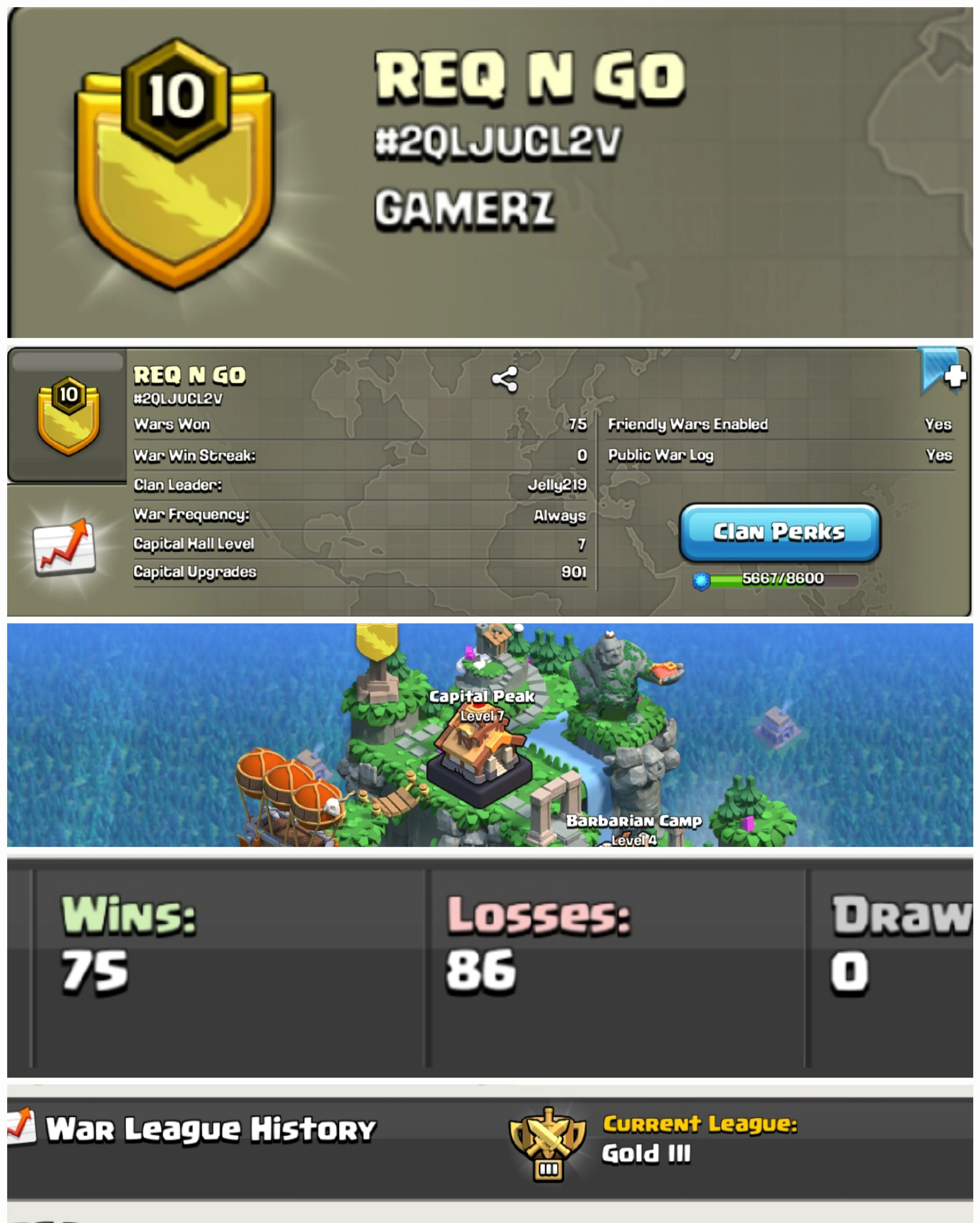 Req And Go !! LEVEL 10.5 !! CAPITAL PEAK 6 !! WIN 61 LOSS 66 !! GOLD 2 !! MOST DEMANDING CLAN !! CHEAP !! INSTANT DELIVERY