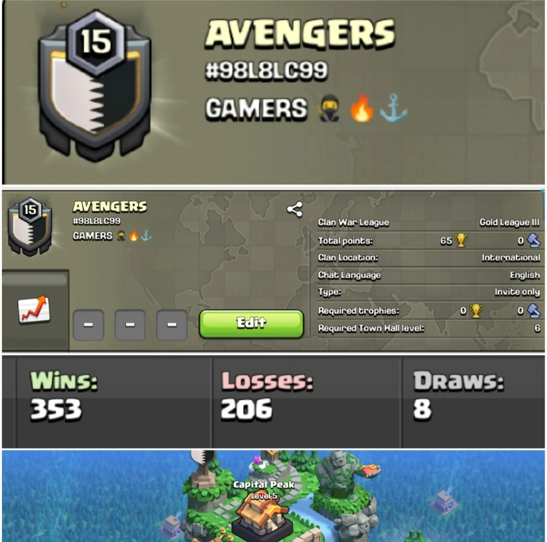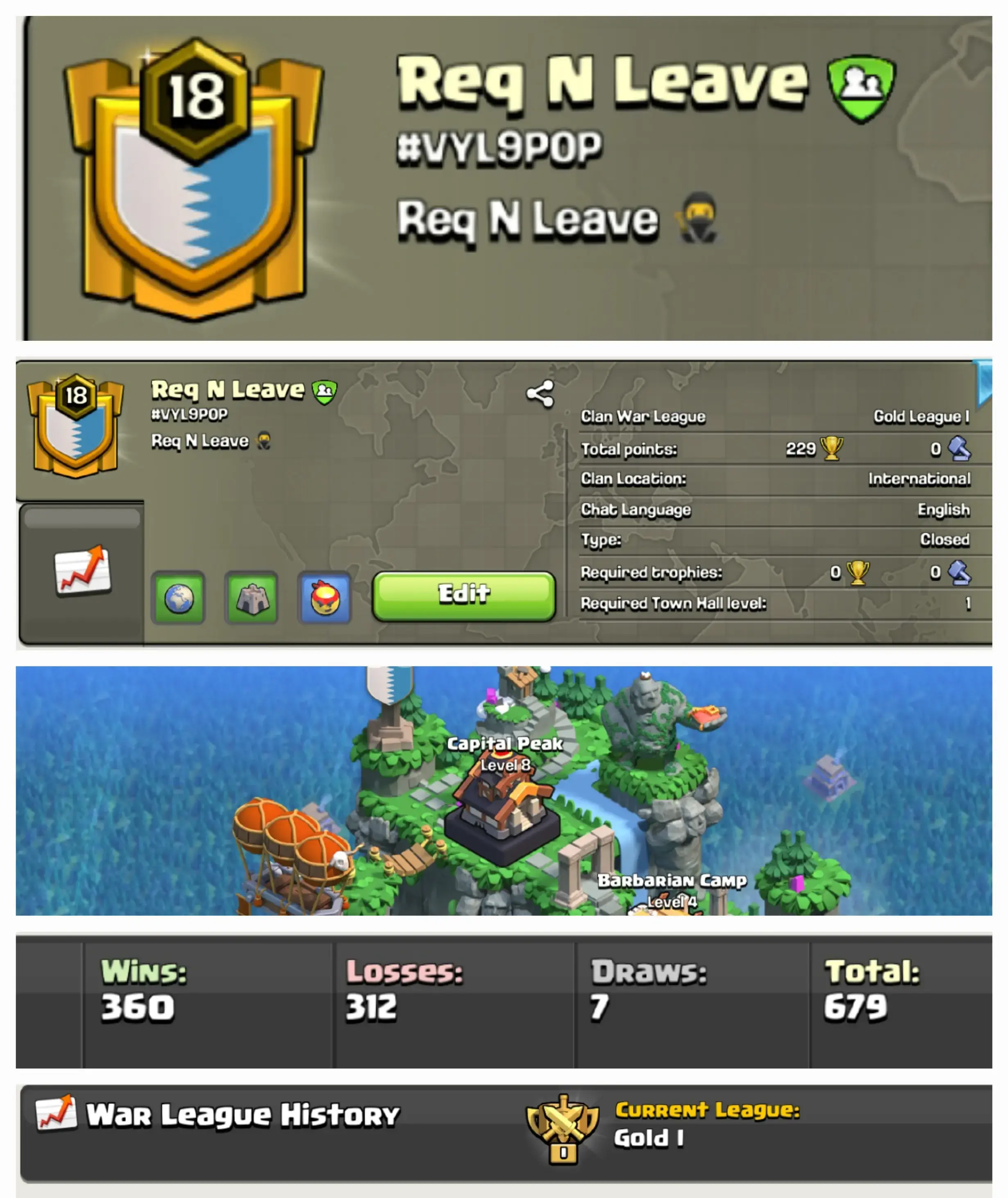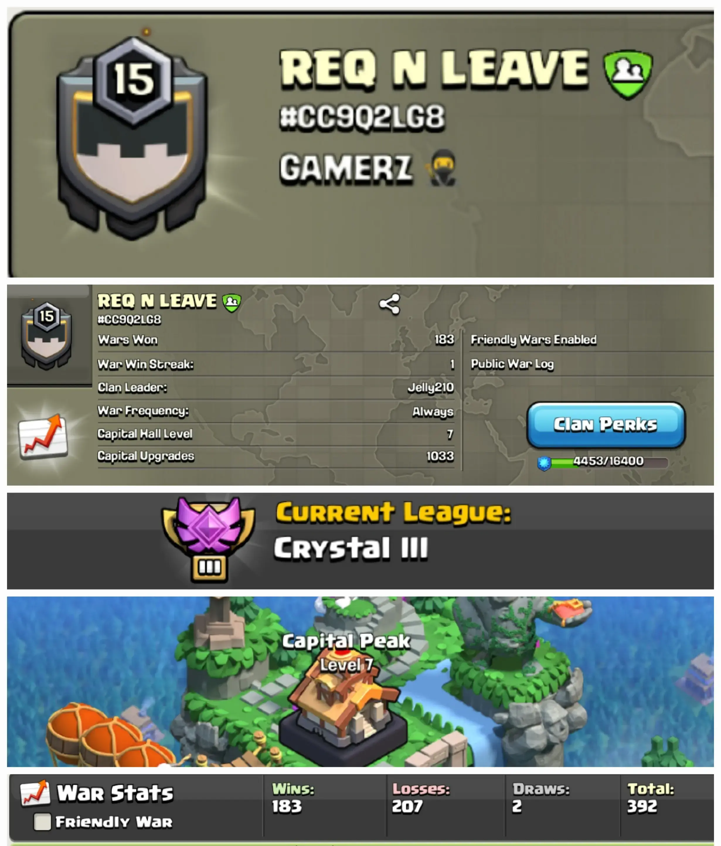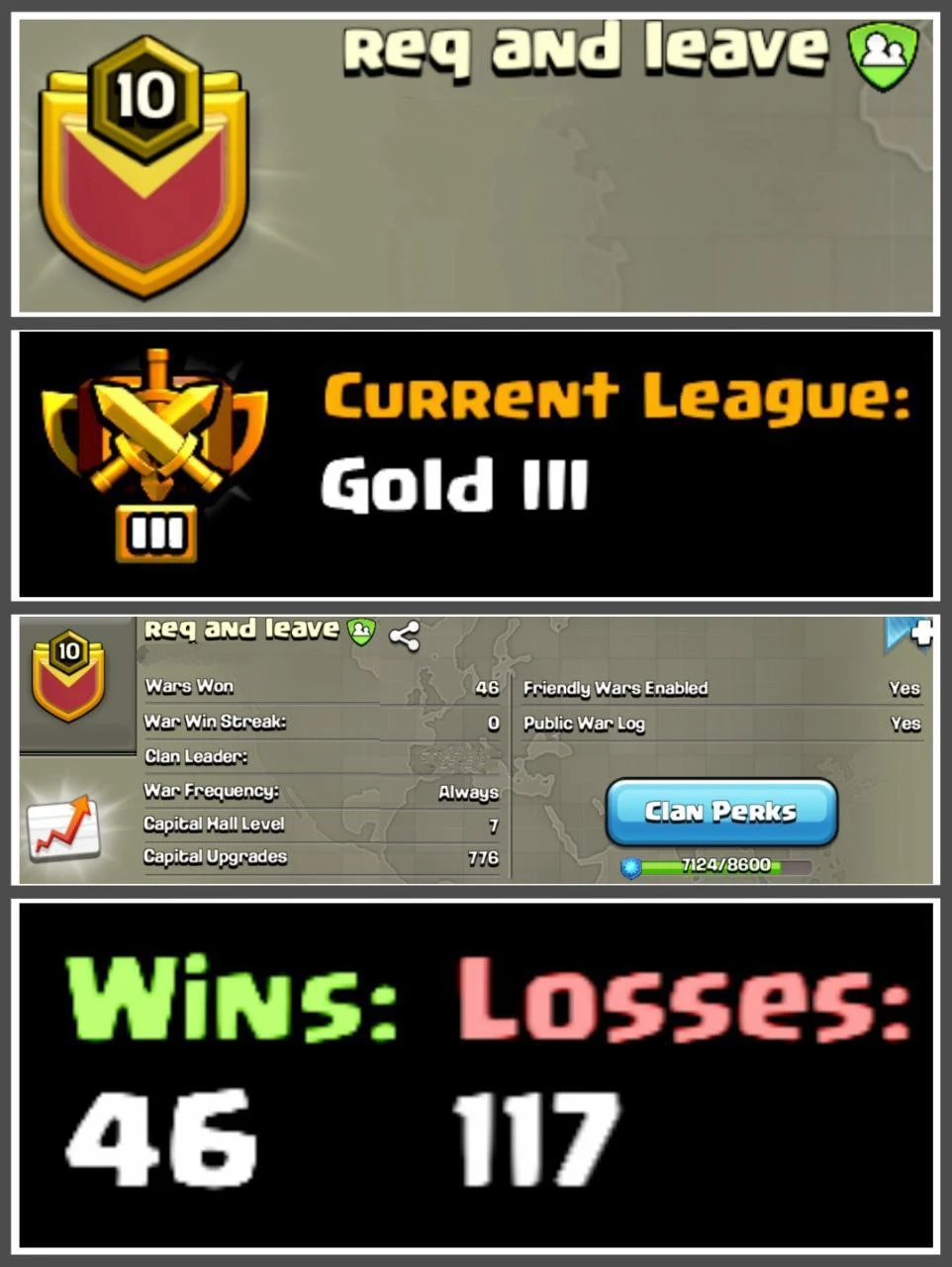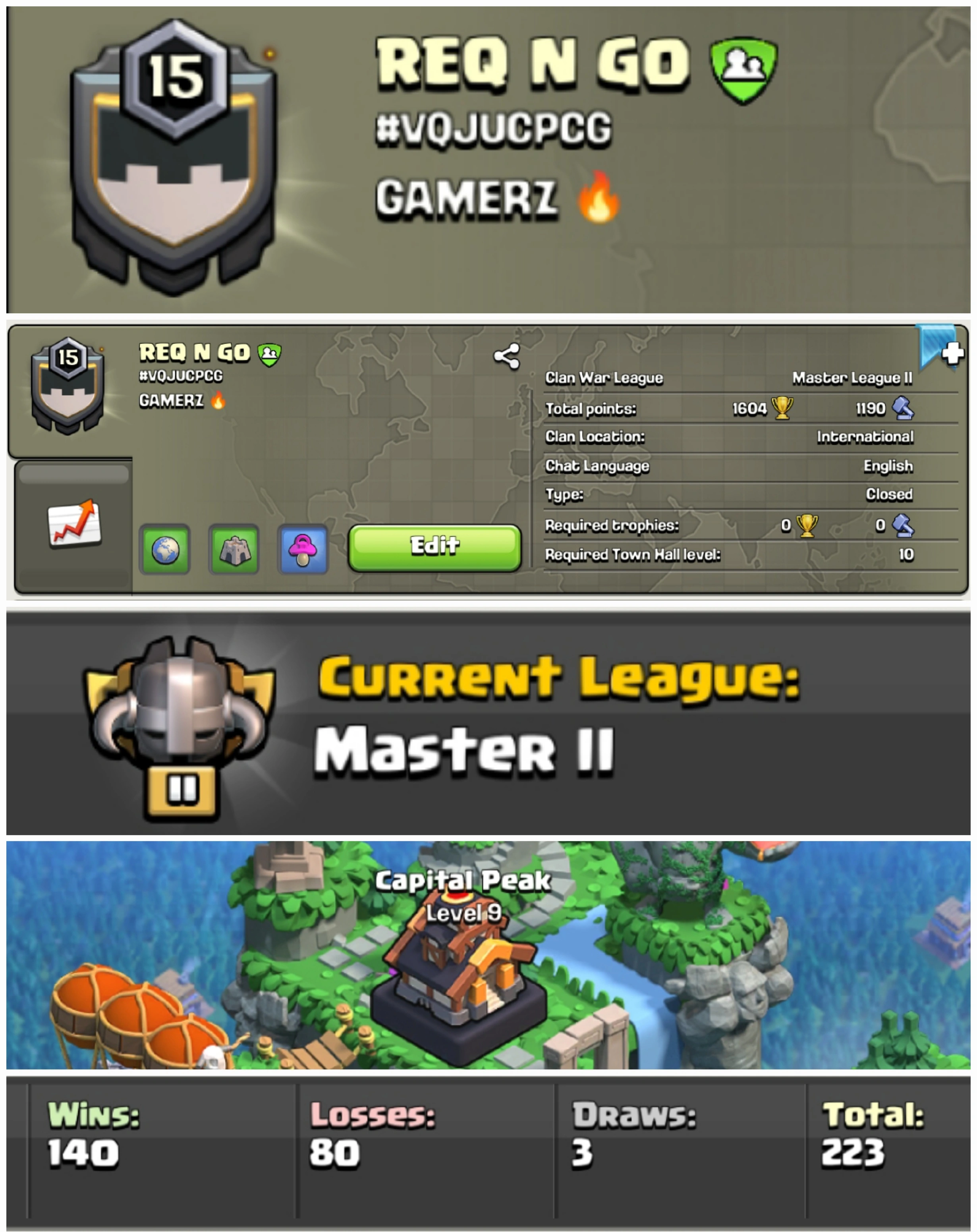 Req And Go !! LEVEL 10.5 !! CAPITAL PEAK 6 !! WIN 61 LOSS 66 !! GOLD 2 !! MOST DEMANDING CLAN !! CHEAP !! INSTANT DELIVERY