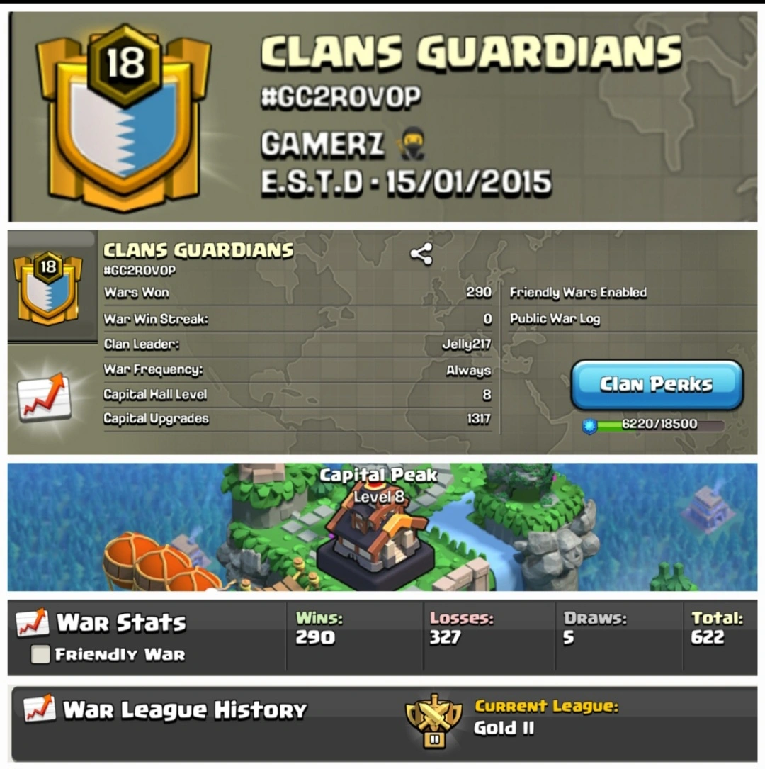 CLANS GURADIANS !! LEVEL 18 !! WIN 290 LOSS 327 !! CAPITAL PEAK 8 !! GOLD LEAUGE 2 !! AFFORDABLE !! FAST DELIVERY