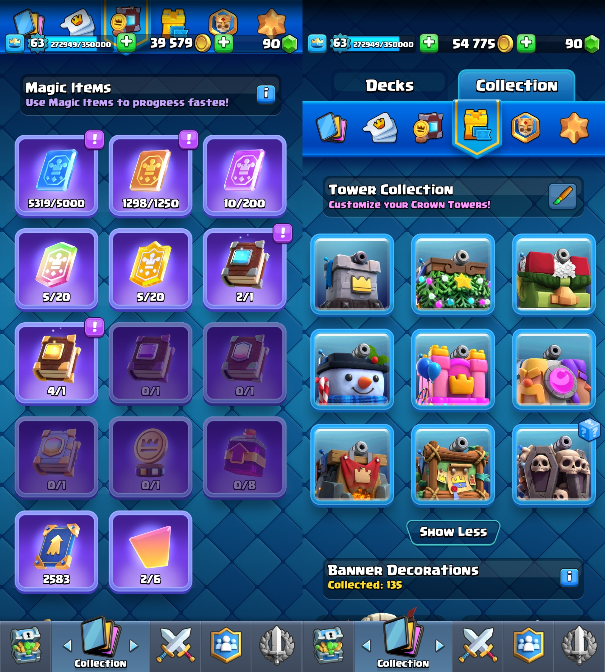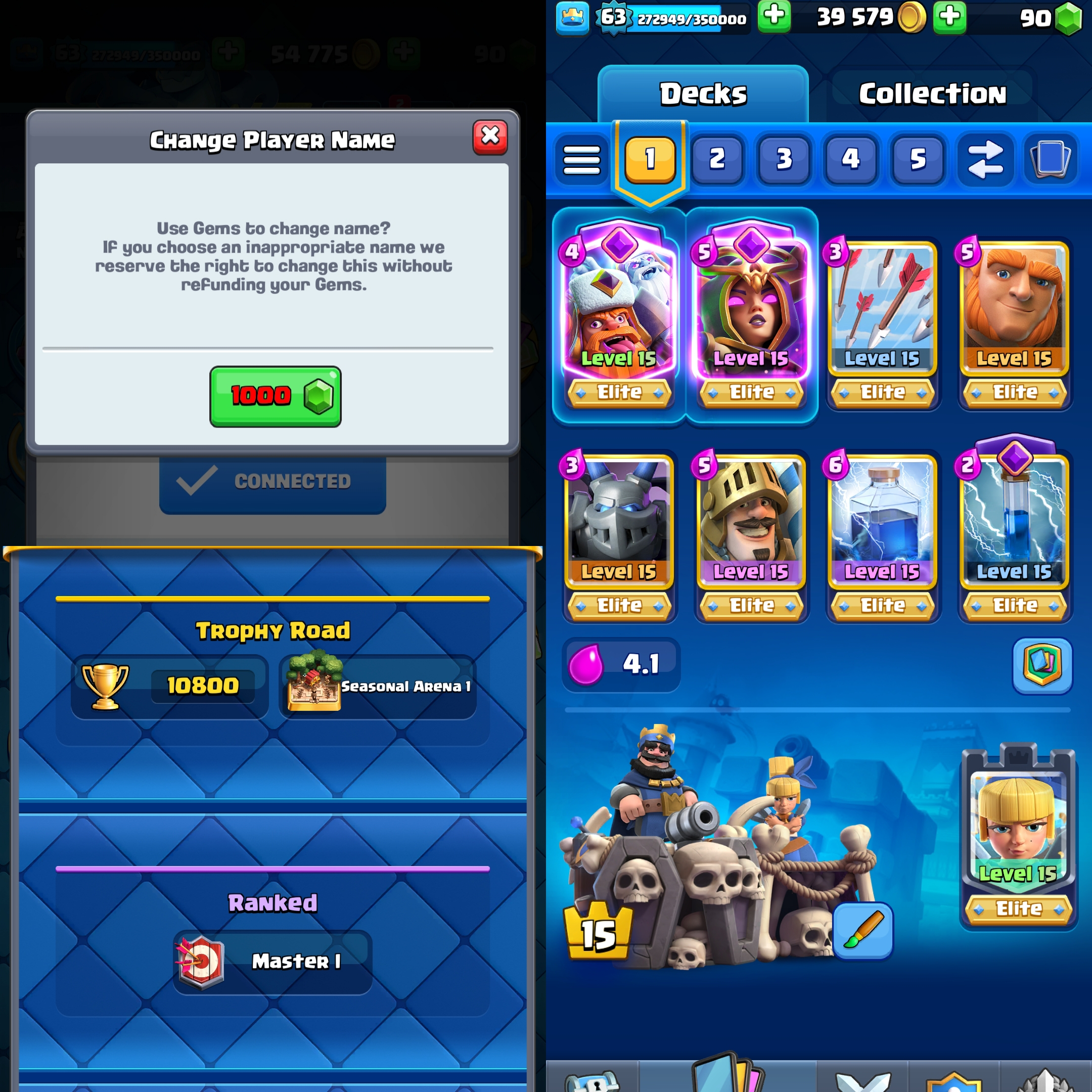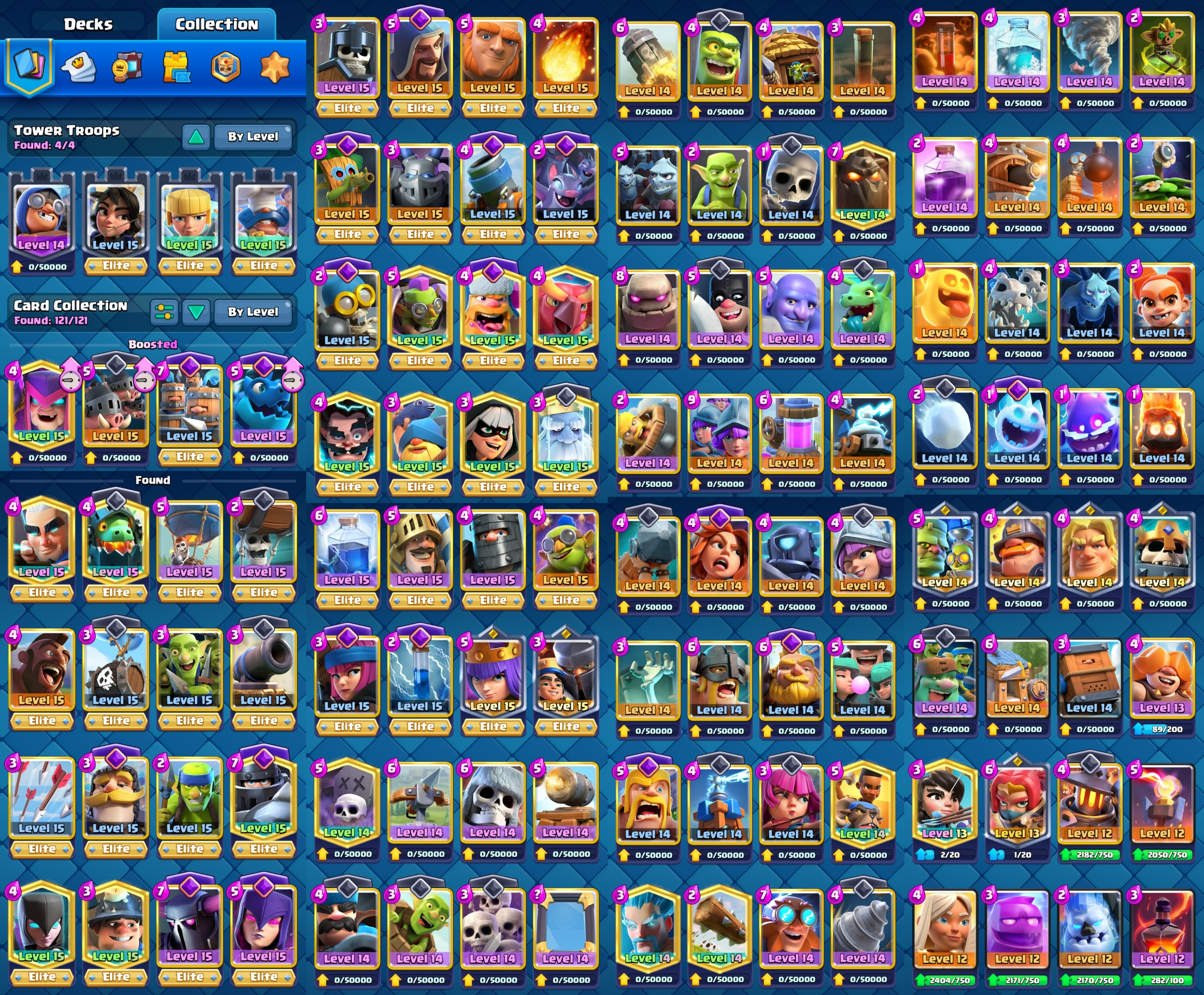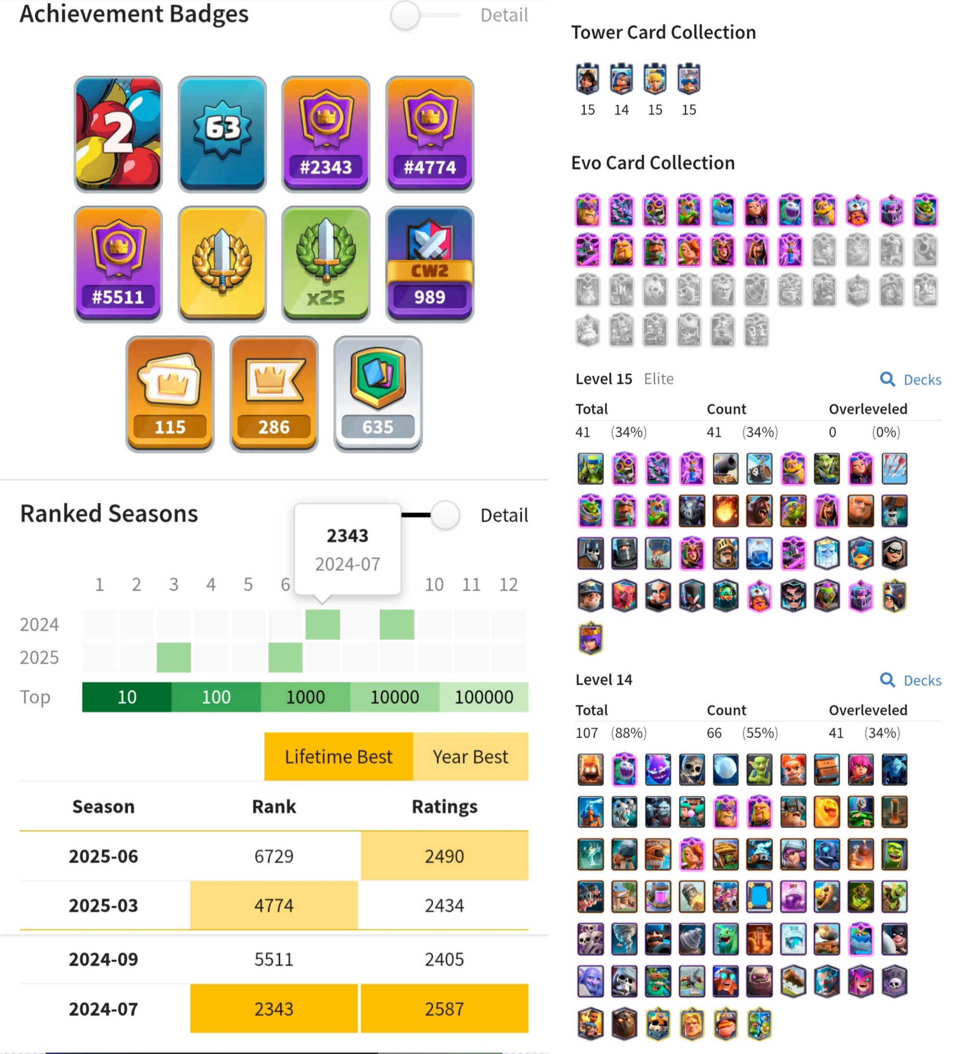 4 TIME RANKED ⭐ KT 15 ⭐ 63 XP ⭐ 18 EVOLUTION ⭐ 41 ELITE ⭐ 107 MAX CARD ⭐ 10800 TROPHY ⭐ 8 TOWERSKINS ⭐ NAMECHANGE 1K ⭐ 115 EMOTES