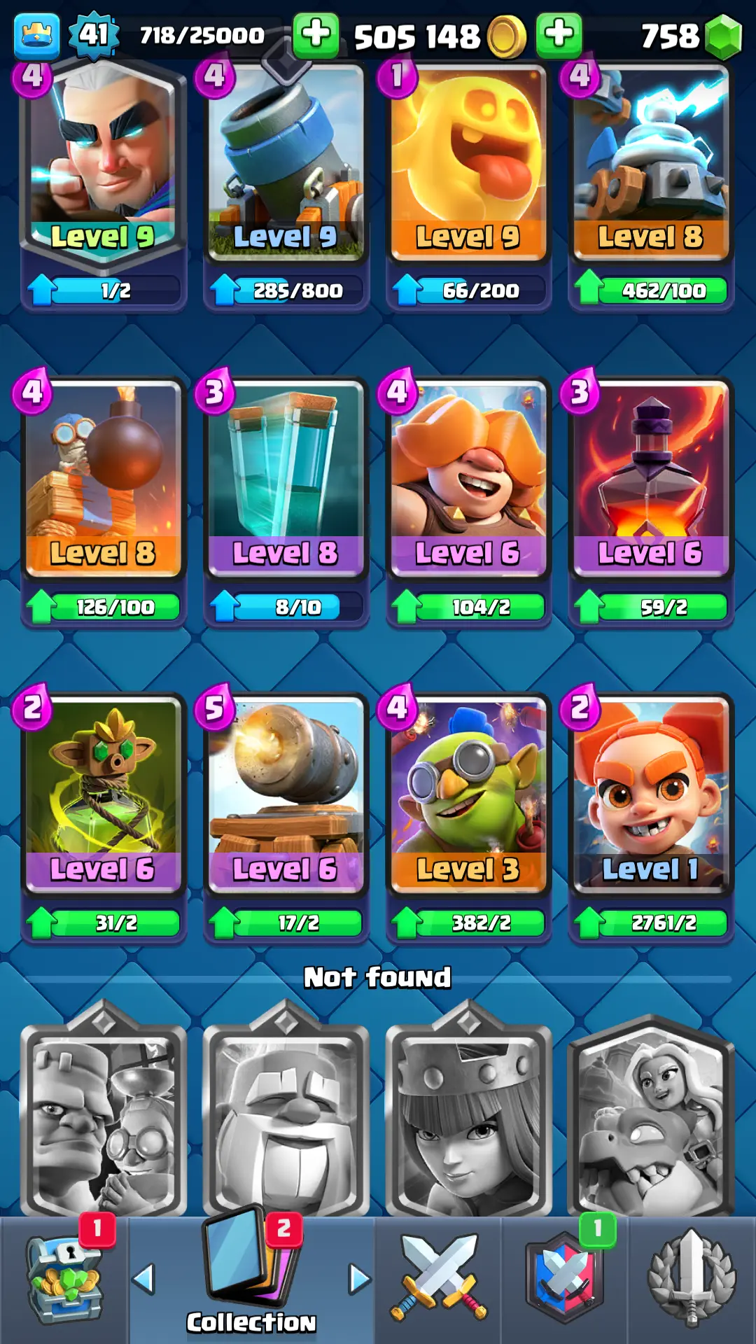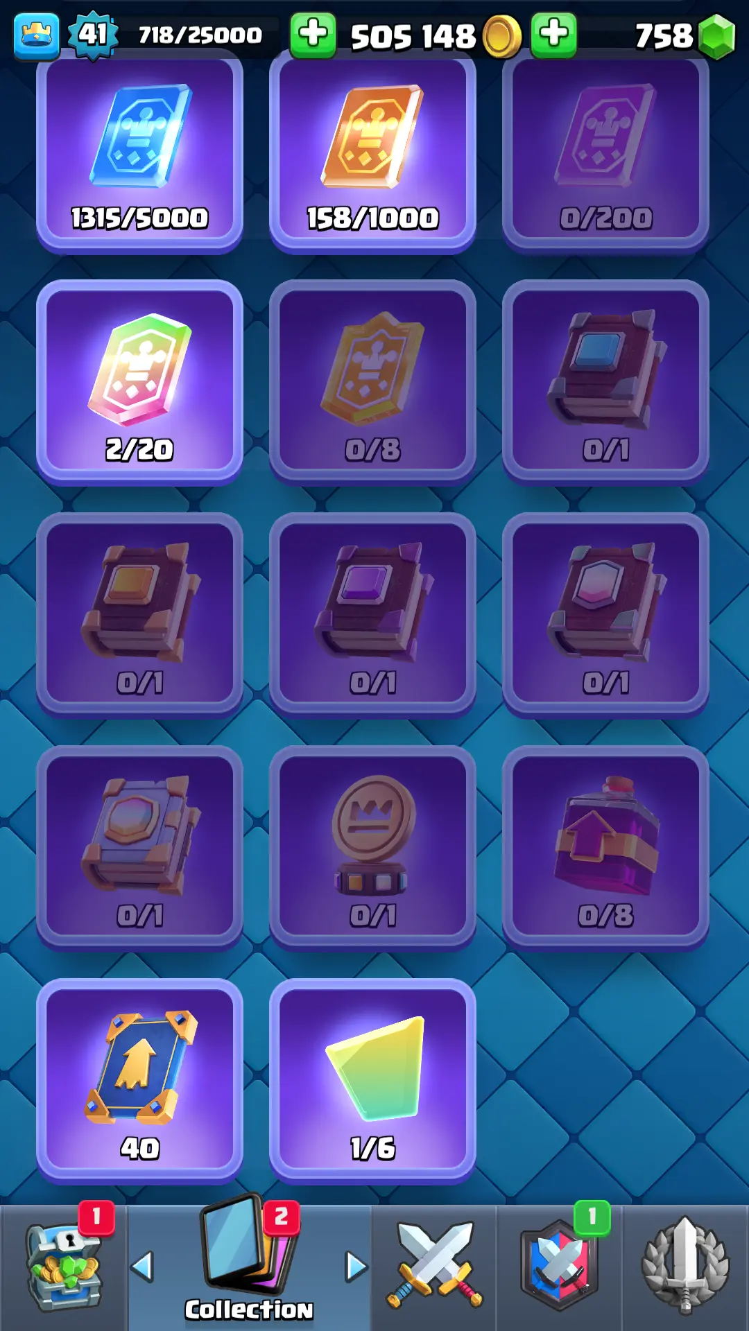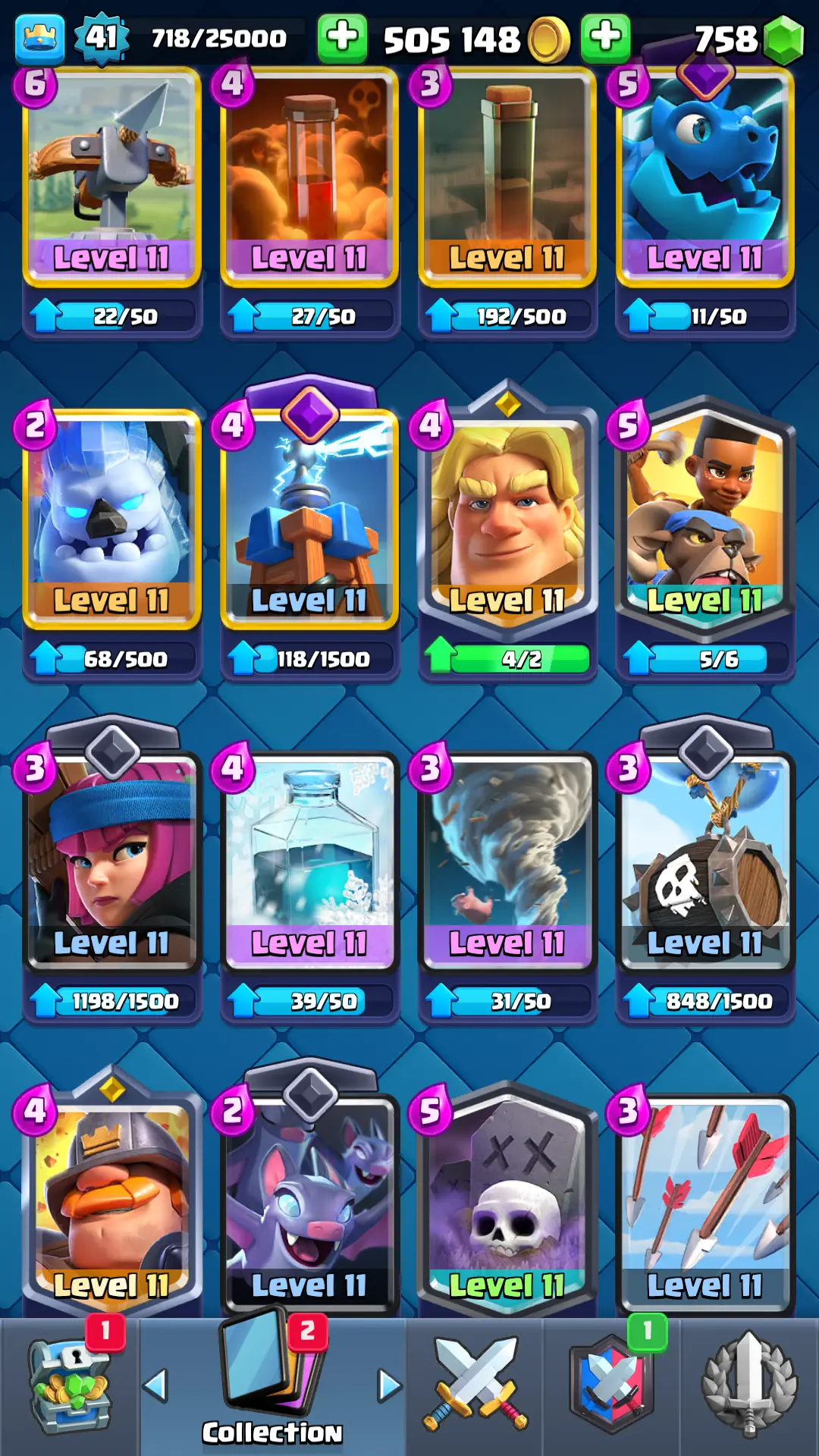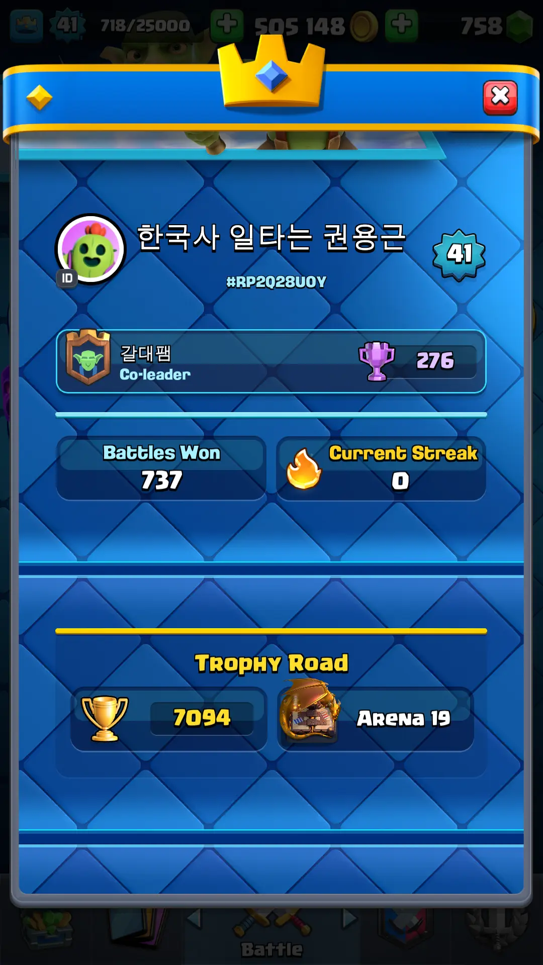 7094 TROPHY 🏆 13 KT 🚀 LVL 41 👑 116 CARDS 🍉 1 MAX CARDS 👑 1 ELITE CARDS ⚡ 18 EMOTE 🚀 EVO 4 🎭 #RP2Q28U0Y ⸱ TAG ACCOUNT ♥️