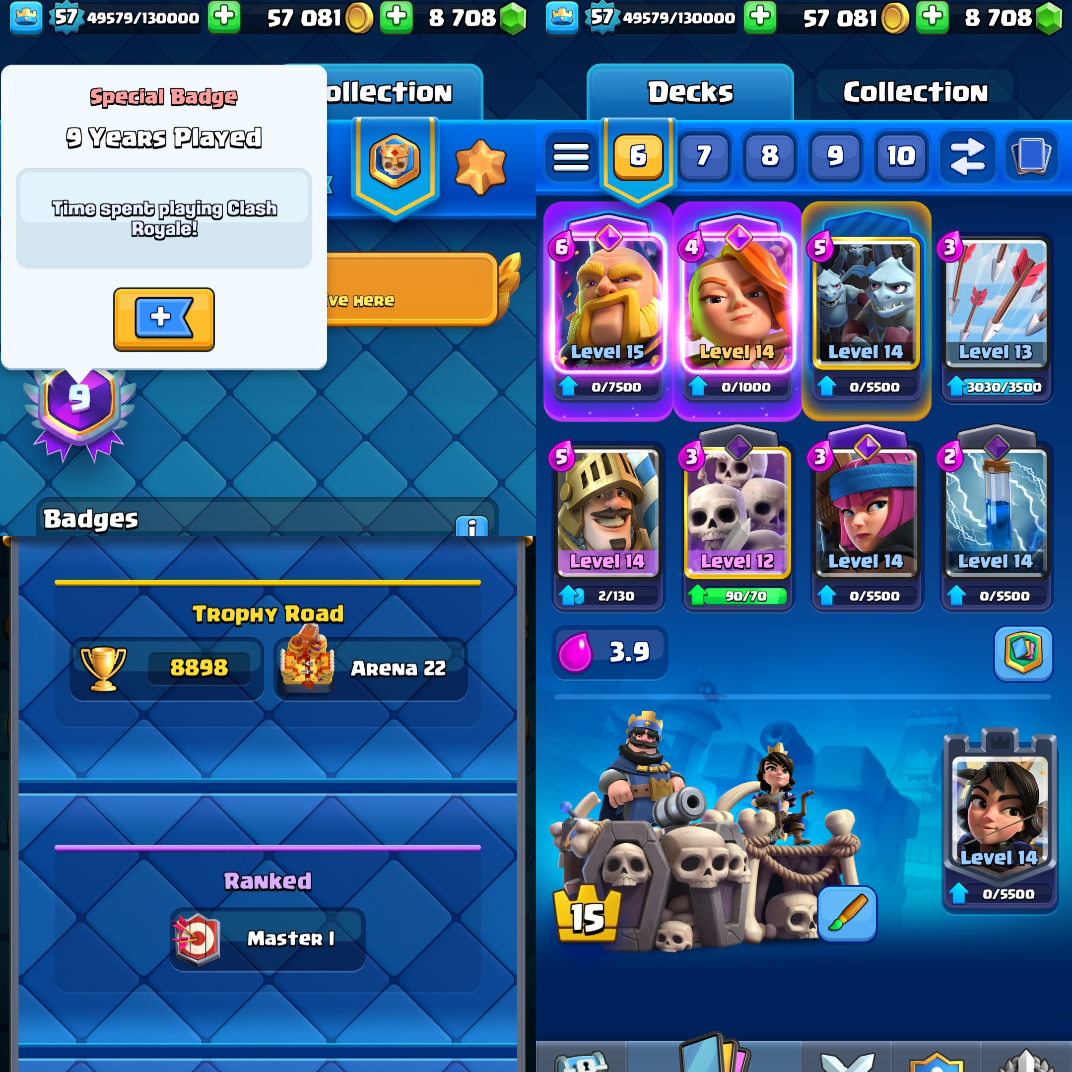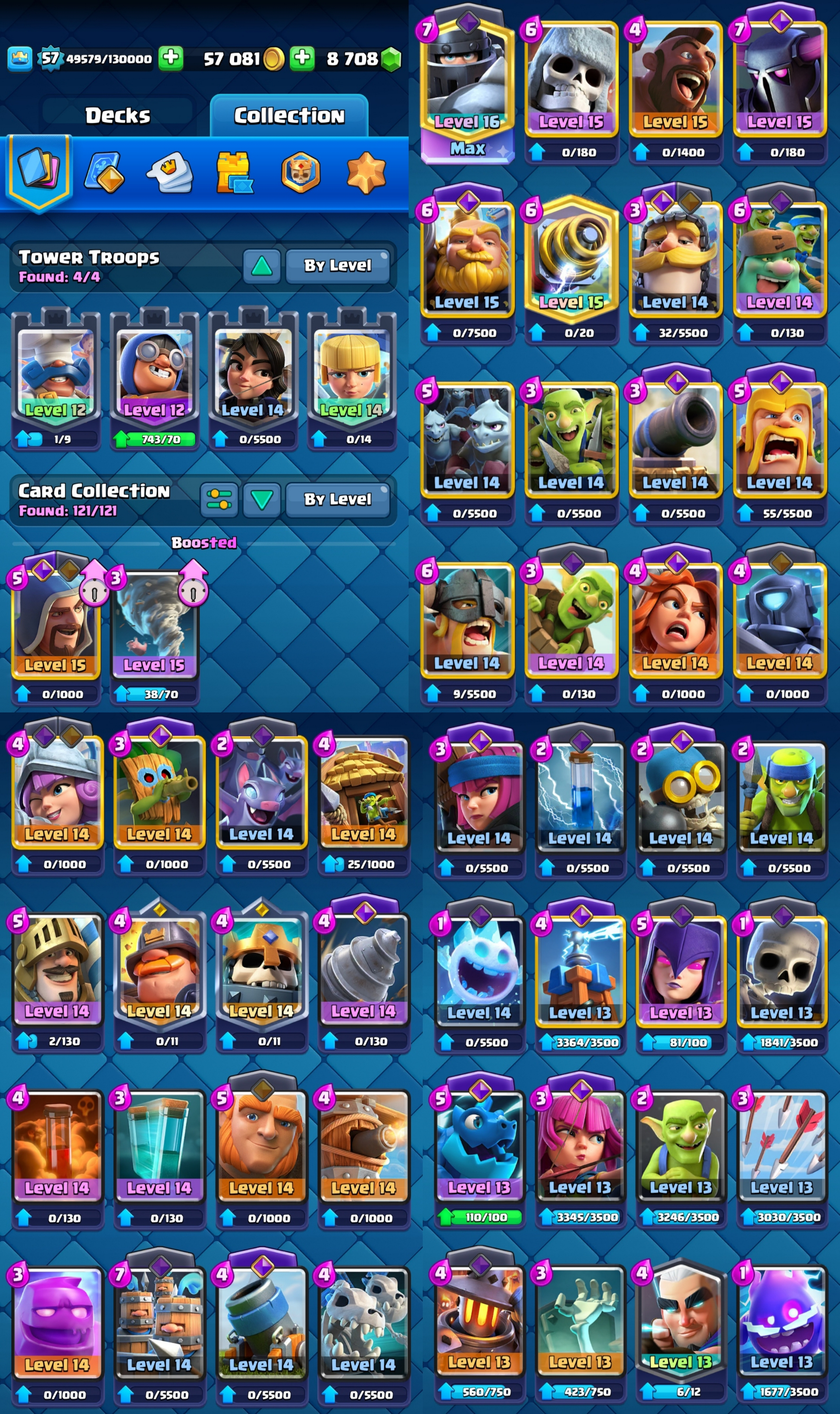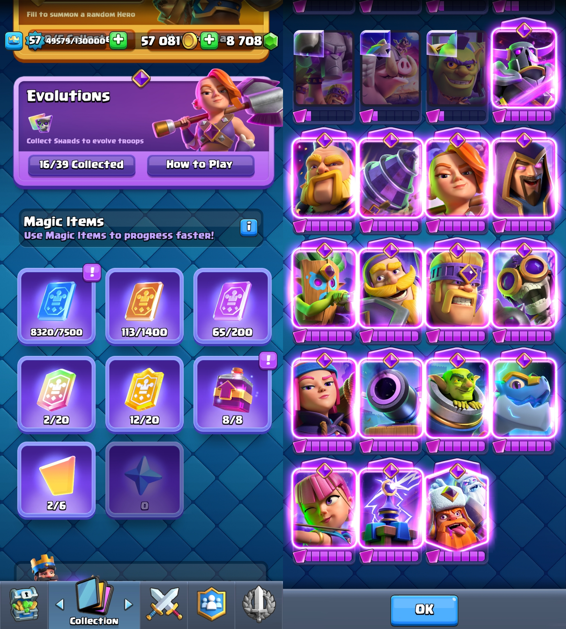 { Exclusive 8700 Gems } KT 15 ⭐ 57 EXP ⭐ 16 Evolution ⭐ 1 Level 16 Card , 5 Level 15 Cards , 32 Level 14 Cards ⭐ Namechange Free ⭐ 3 Rulers & 4 Rulers skins ⭐ All cards ⭐ 5 Tower Skins ⭐ 59 Emotes ⭐ MAGIC Items