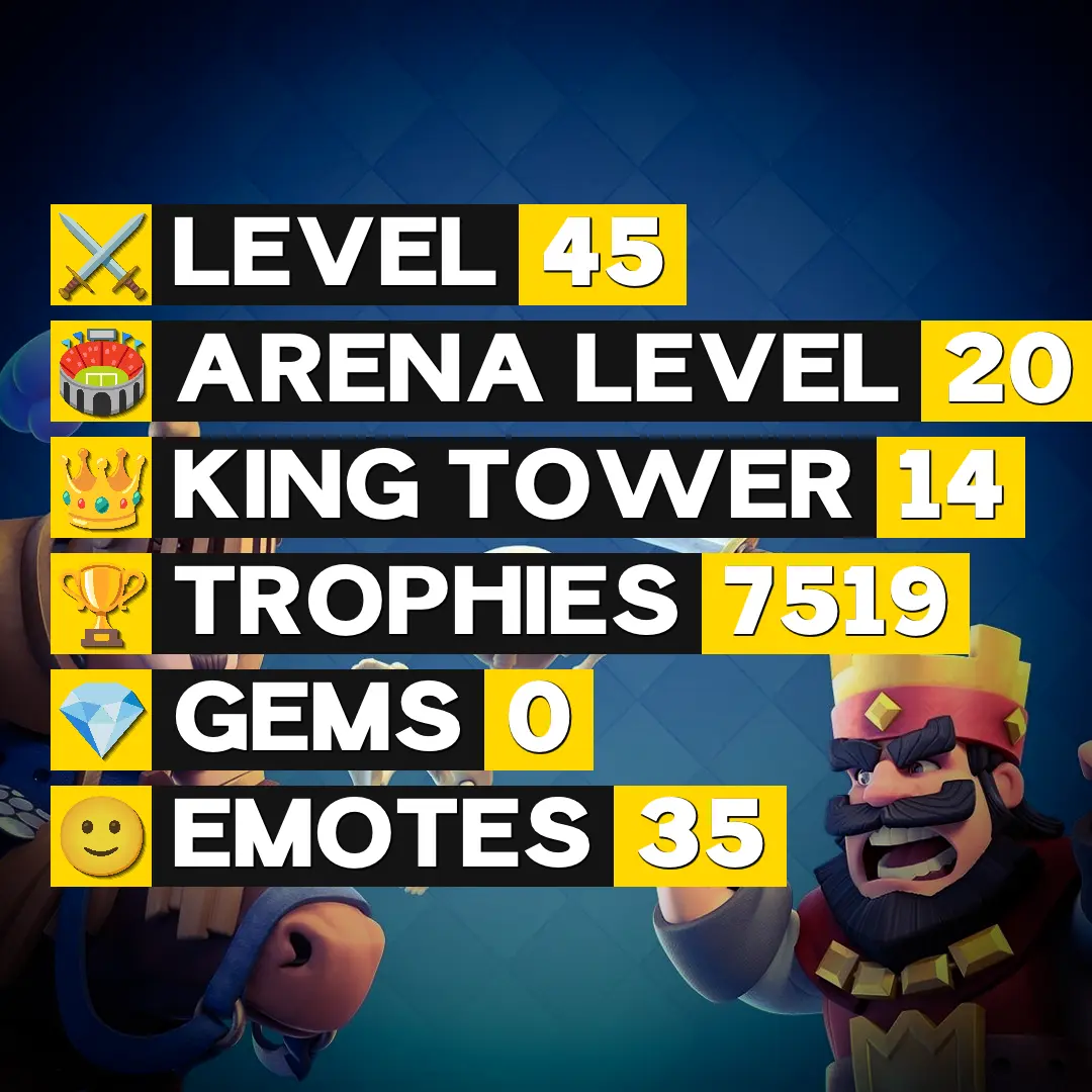 👑 King Tower 14 🏆 7519 Trophies ⚔️ Level 45 💎 Gems: 0 🧬 Evolutions: 2 🔒 Recovery Codes