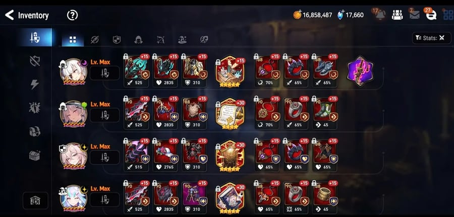 O investimento de tempo cresce exponencialmente quando se busca heróis específicos ou peças perfeitas de equipamento. Heróis Moonlight exigem bookmarks galácticos conquistados lentamente por meio de conteúdo mensal ou medalhas místicas das Guild Wars. Unidades de colaboração limitada aparecem uma única vez e podem nunca mais retornar. A farmagem de equipamentos funciona em camadas RNG, onde você precisa de drops do conjunto correto, com os principais atributos certos e subatributos adequados, tudo na mesma peça.