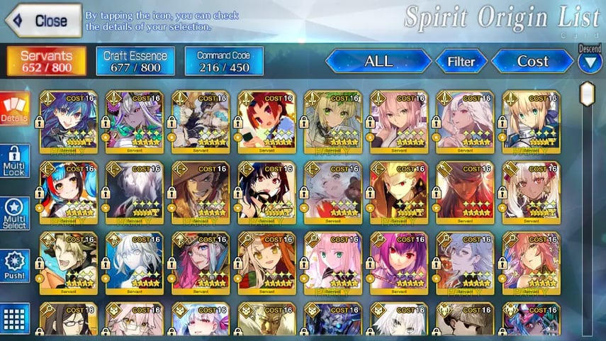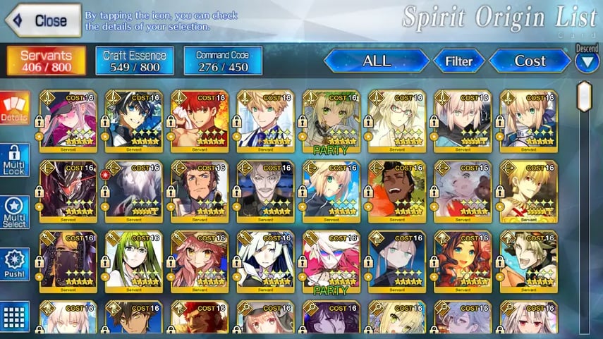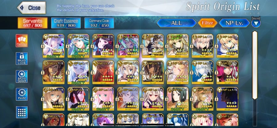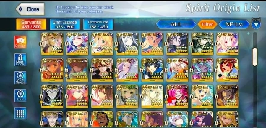 FGO365: NA | Lv155 | 1889 days| 49 SSR | 58 WNP | 132 SR | Aerial Drive MLB | 43 SSR Max Skills | 49 SSR Ascensions | 799 Golden Fruits | 80 Crystallized Lores | 20 Holy Grails | 543M QP