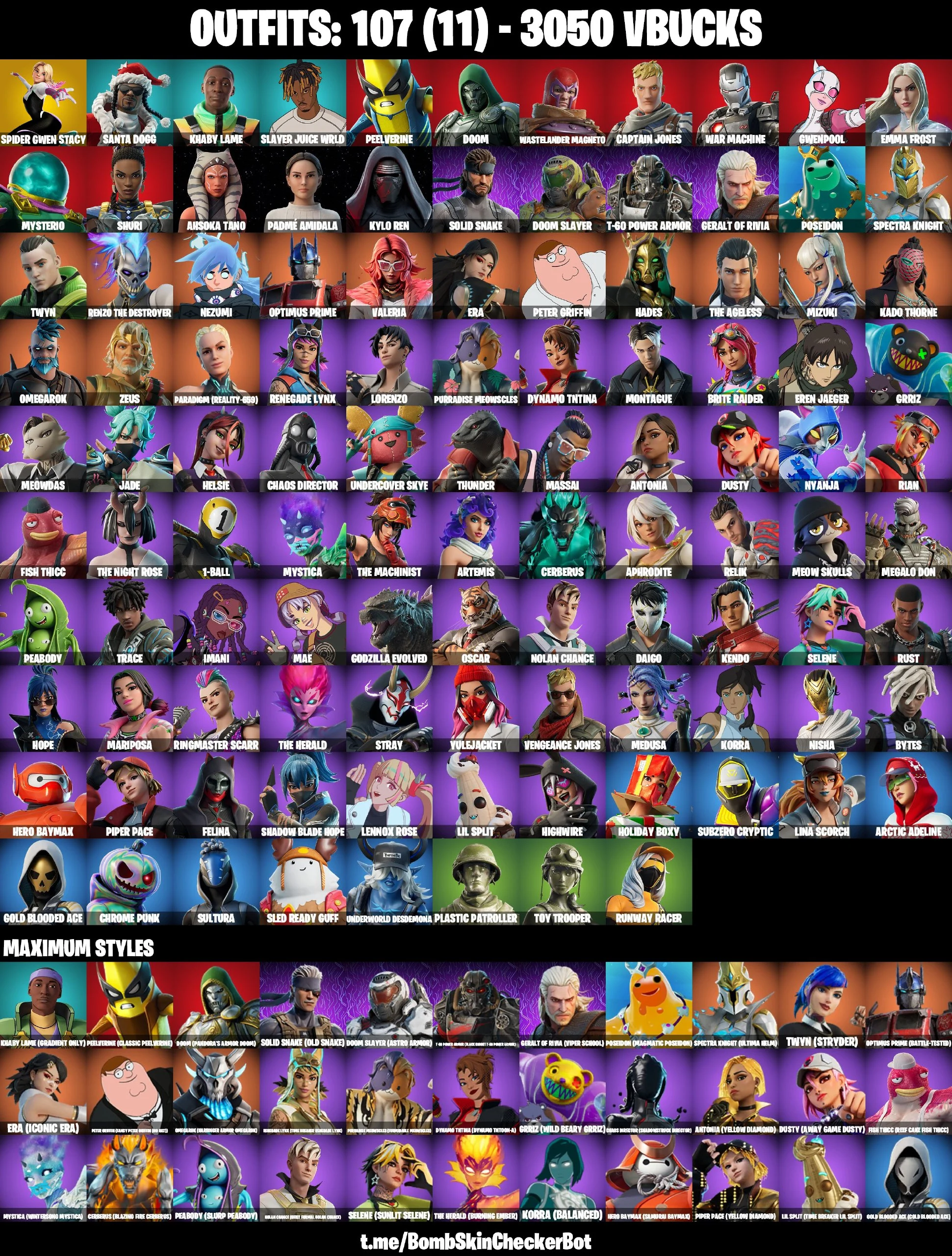 🔮107 Skins🔮 Spidergwen (Stacy)💎Padme Amidala💎Sultura💎Meow Skulls💎Eren Jaeger💎Khaby Lame💎Ashoka Tan