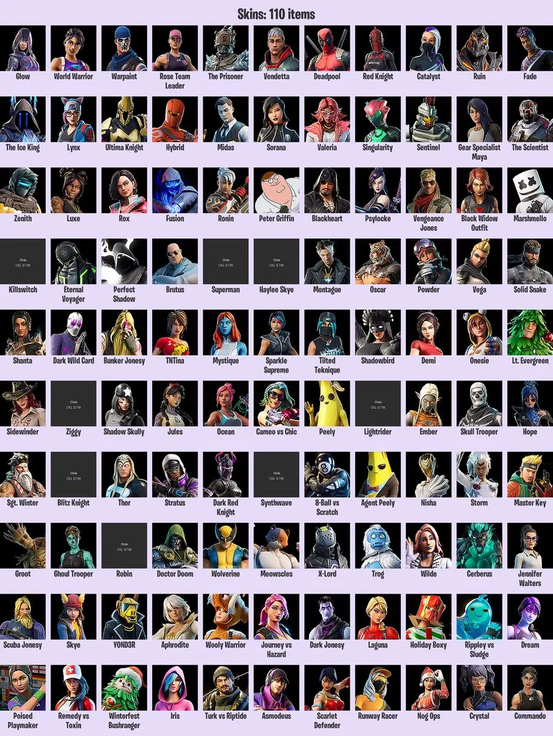 110 Skins|OG STW|Glow|World Warrior|Warpaint|Rose Team Leader|The Prisoner|Vendetta|Deadpool|Red Knight|Catalyst|Ruin|Fade|The Ice King