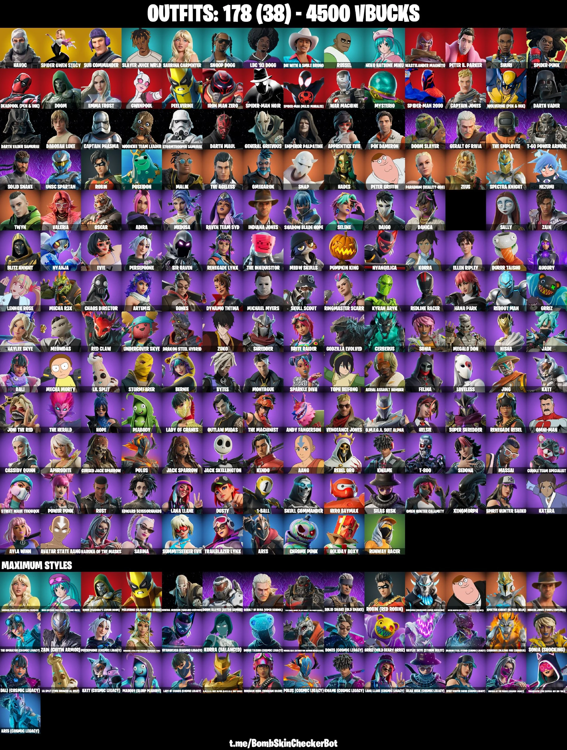 🔮178 Skins🔮 Spidergwen (Stacy)💎Havoc💎Sub Commander💎Darth Vader💎Meow Skulls💎Spiderman (Miles Morales)💎Spiderman 2099
