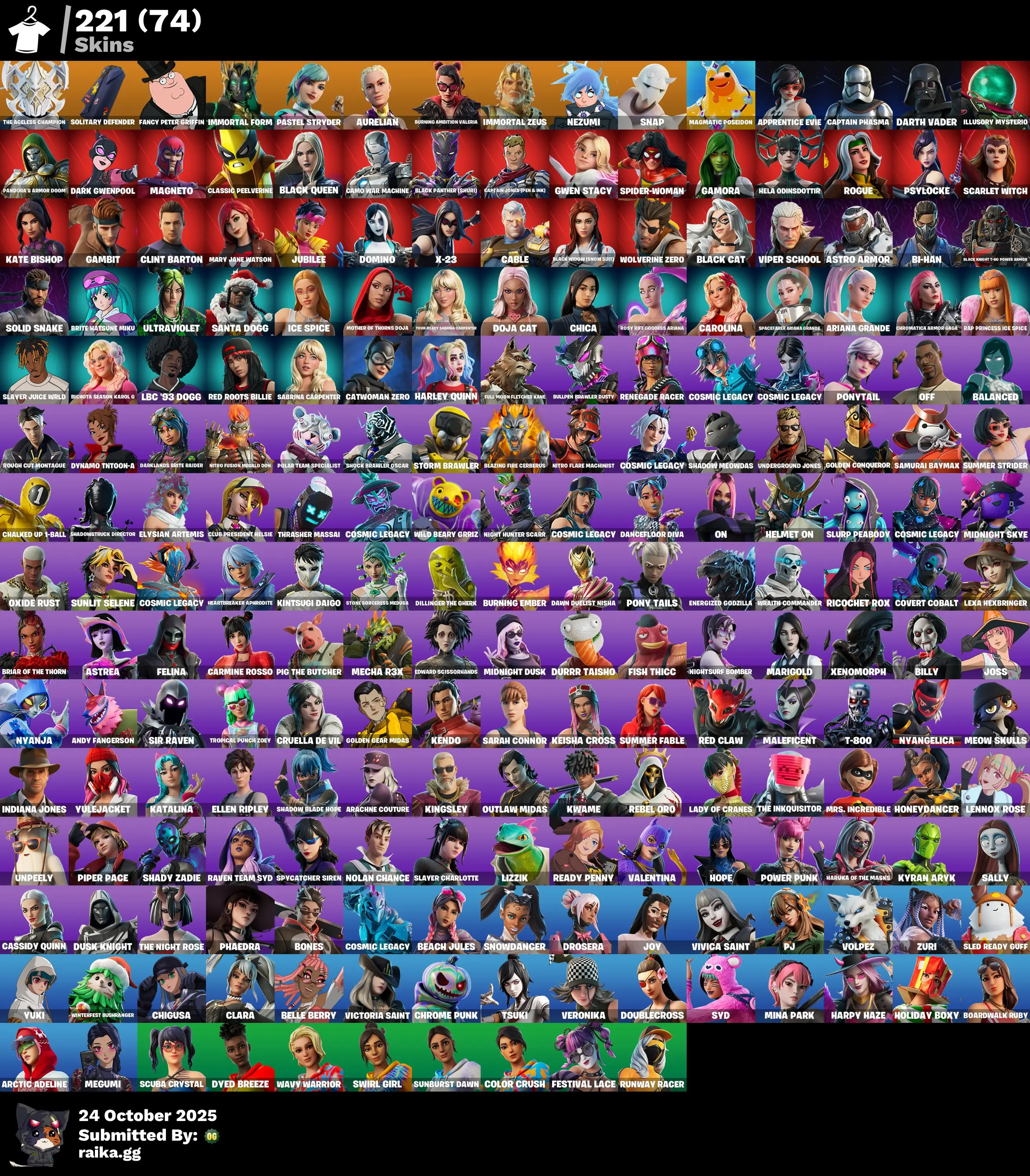 218 skins | Psylocke🎃Wastelander Magneto🎃Kate Bishop🎃Captain Phasma🎃Peter Griffin🎃Nezumi🎃Peelverine🎃Poseidon🎃Cable🎃Paradigm (Reality-659)🎃Twyn🎃Hela Odinsdottir🎃Rogue🎃Malik🎃Hades🎃The Ageless🎃Darth Vader🎃Apprentice Evie🎃Snap🎃Valeria D5192