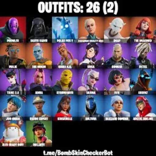 26 SKINS✅DARTH VADER✅ERISA✅POLAR PEELY✅KRISABELLE✅SULTURA✅BLIZZARD BOMBER✅ARCTIC ADELINE✅SLED READY GUFF