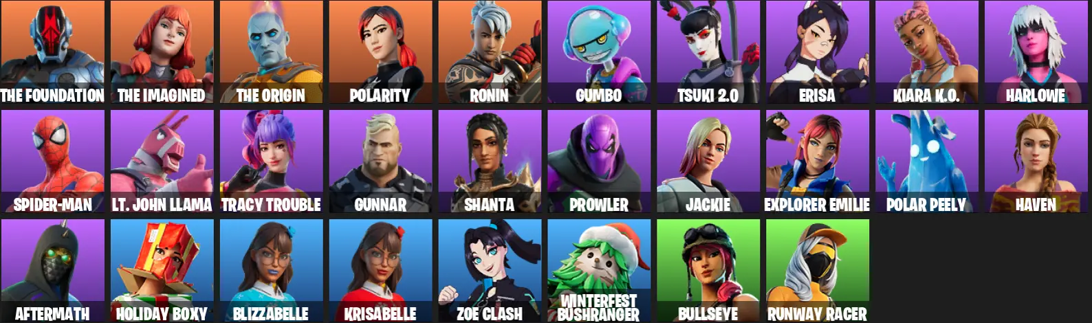 29 skins | Explorer Emilie | The Imagined | Polarity | The Origin | The Foundation | Ronin | Spider-Man | Prowler | Polar Peely | Erisa