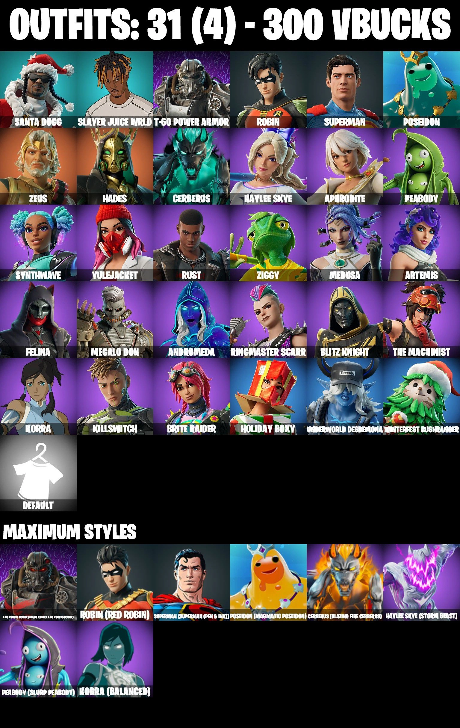 31 SKINS | SUPERMAN MAX | ARTEMIS | HAYLEE SKYE MAX | MEDUSA | APHRODITE | ZEUS | ZIGGY | CAN PLAY ON PSN,XBOX,PC,NINTENDO,MOBILE | 300 VBUCKS | FULL EMAIL ACCESS