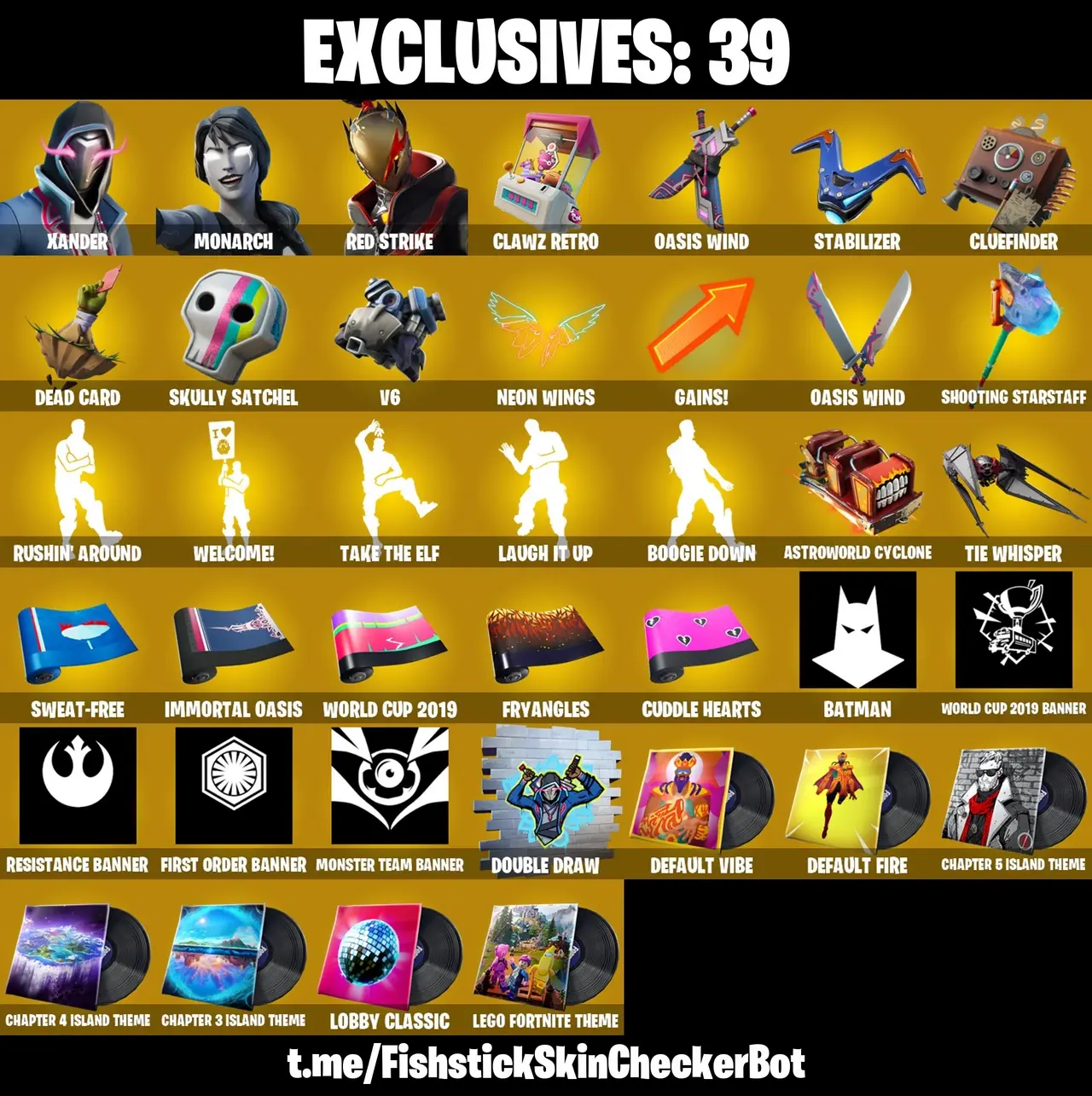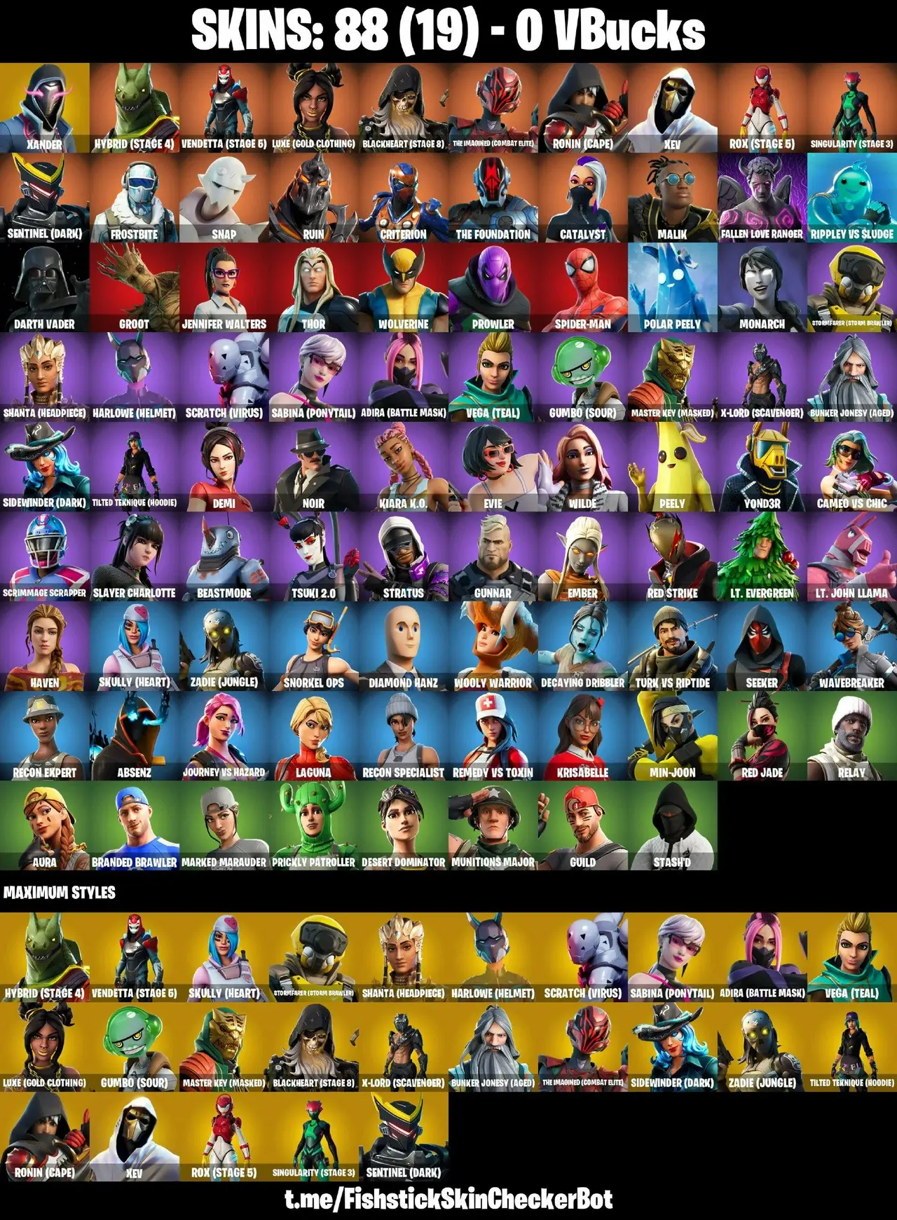⚡ 88 Skins [PC/PSN/XBOX] 🐲 Xander 🌪 Hybrid 💥 Vendetta 💫 Luxe ☠️ Blackheart 🧬 The Imagined ⚡ Ronin 👽 Xev 🎭 Rox 🎯 Singularity 🤖 Sentinel 🧊 Frostbite ✋ Snap 💵 0 VBucks 📜 FULL ACCESS 🆔 FO355