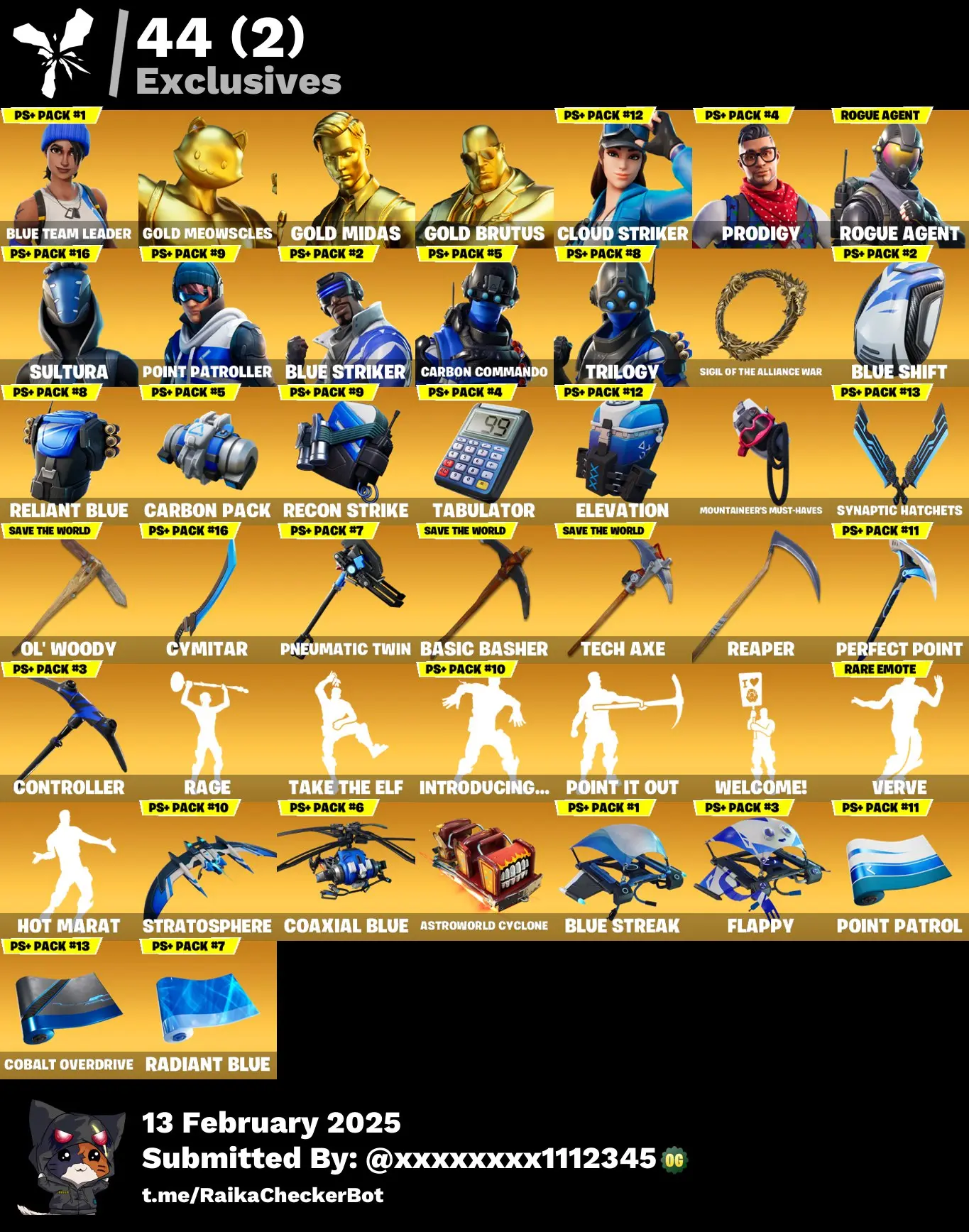 118 skins | Blue Team Leader | Gold Meowscles | Gold Midas | Gold Brutus | Cloud Striker | Prodigy | Rogue Agent | Sultura | Point Patroller | 750 VB