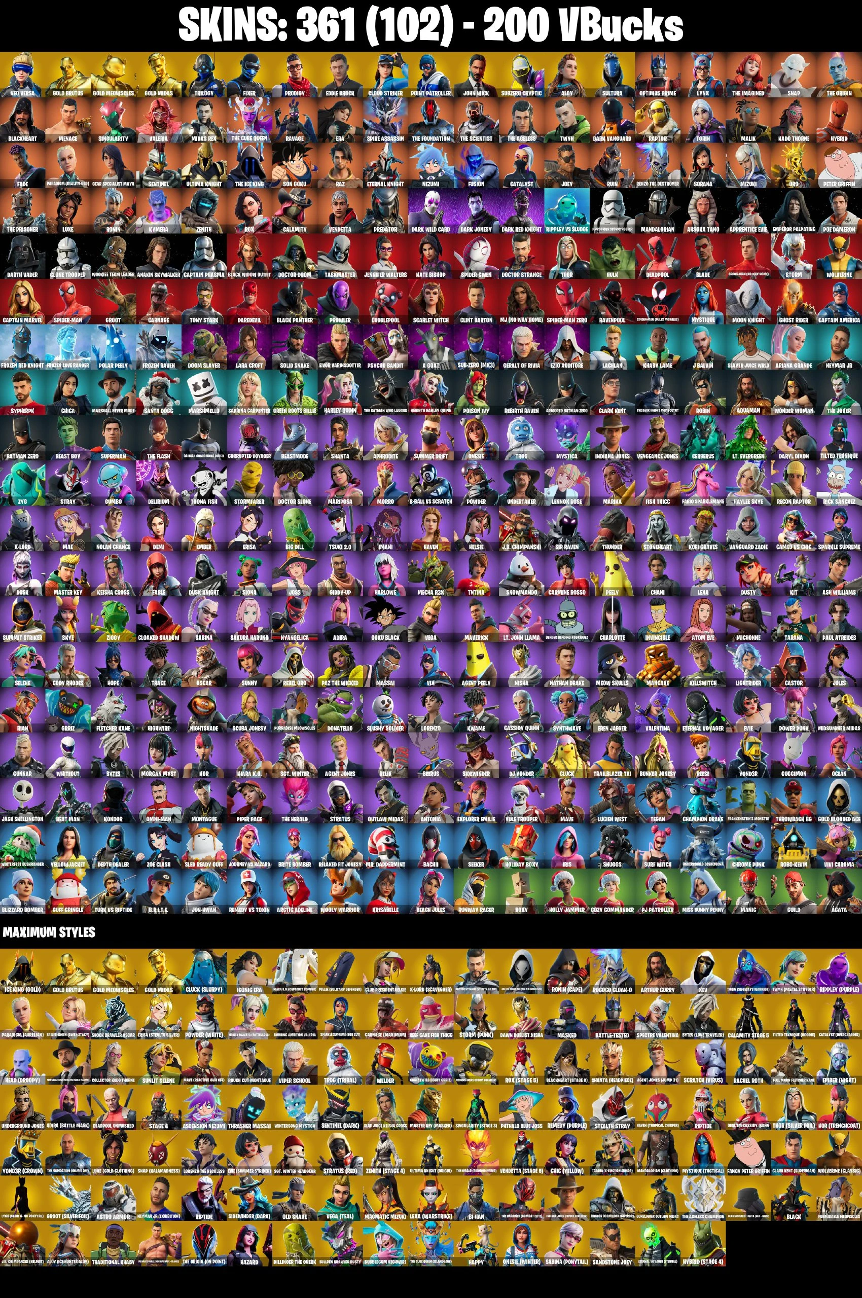 (PC) 200 VB) 361 SKINS / NEO VERSA / GOLD BRUTUS / GOLD MEOWSCLES / GOLD MIDAS / TRILOGY / FIXER / PRODIGY / EDDIE BROCK / CLOUD STRIKER /