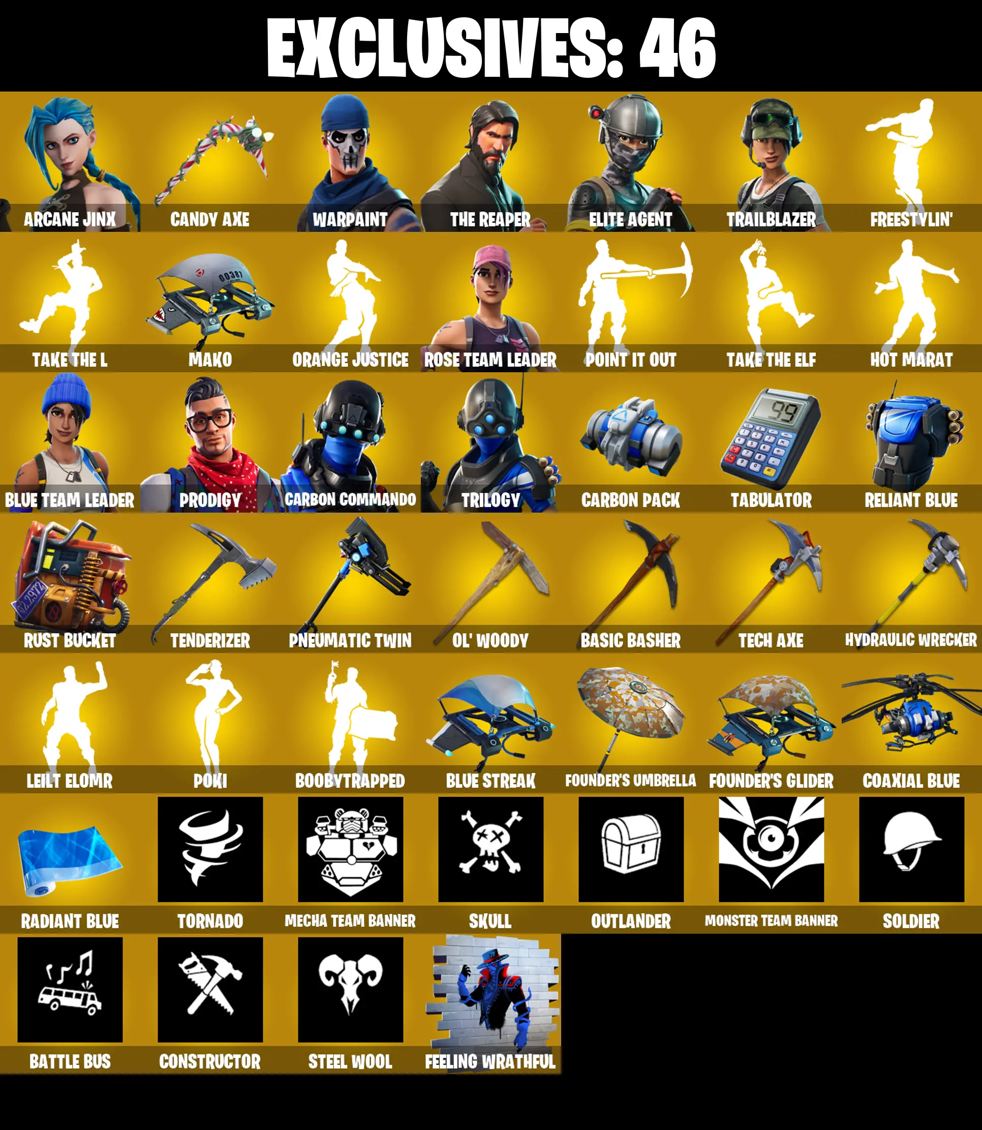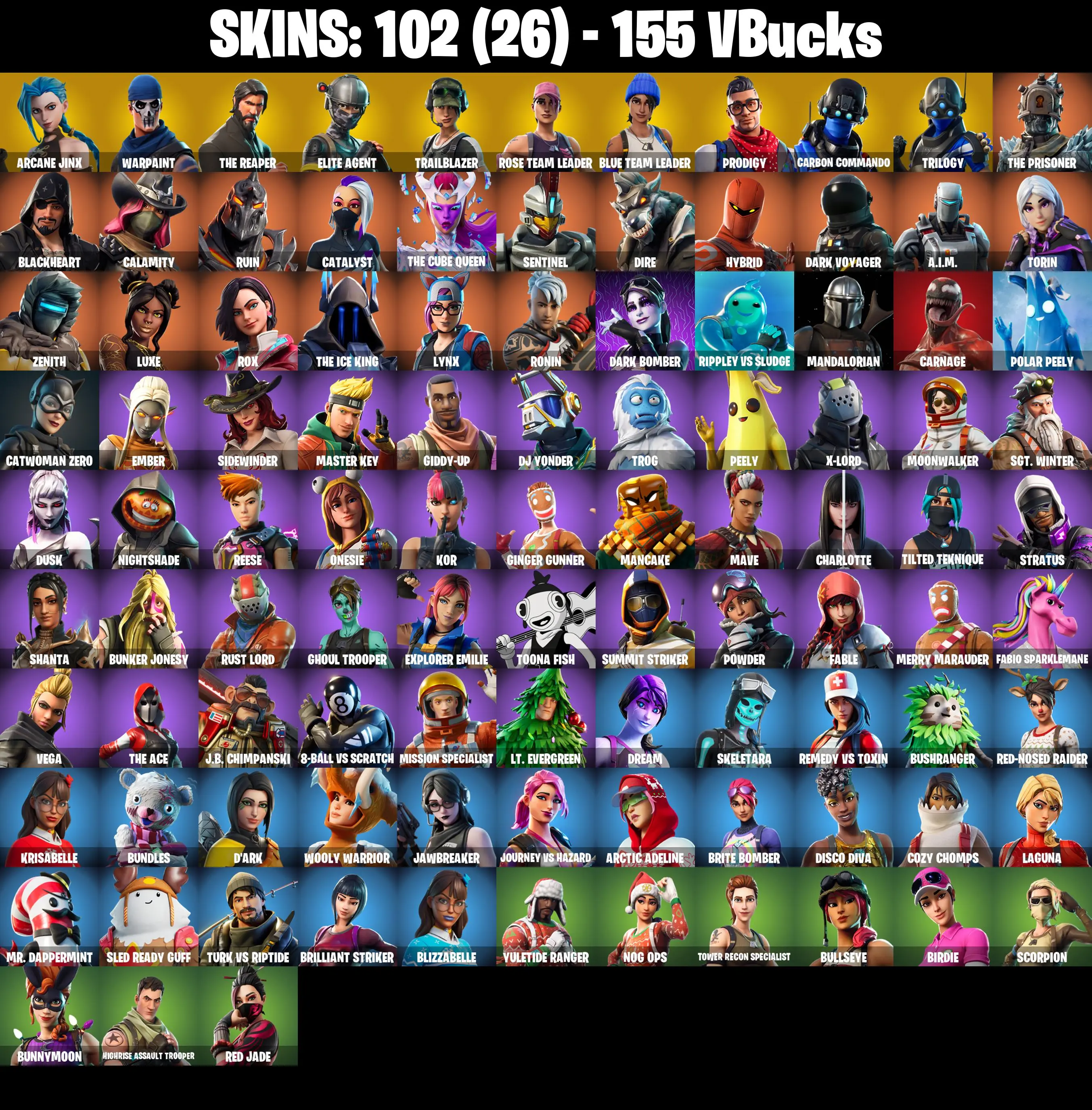 PC/PSN/XBOX ♨️102 skins ✨ OG STW ✨ Arcane Jinx ✨ Candy Axe ✨ The Reaper ✨ Elite Agent ✨ Trailblazer ✨ Freestylin' ✨ Take The L ✨ Mako ✨ #B858