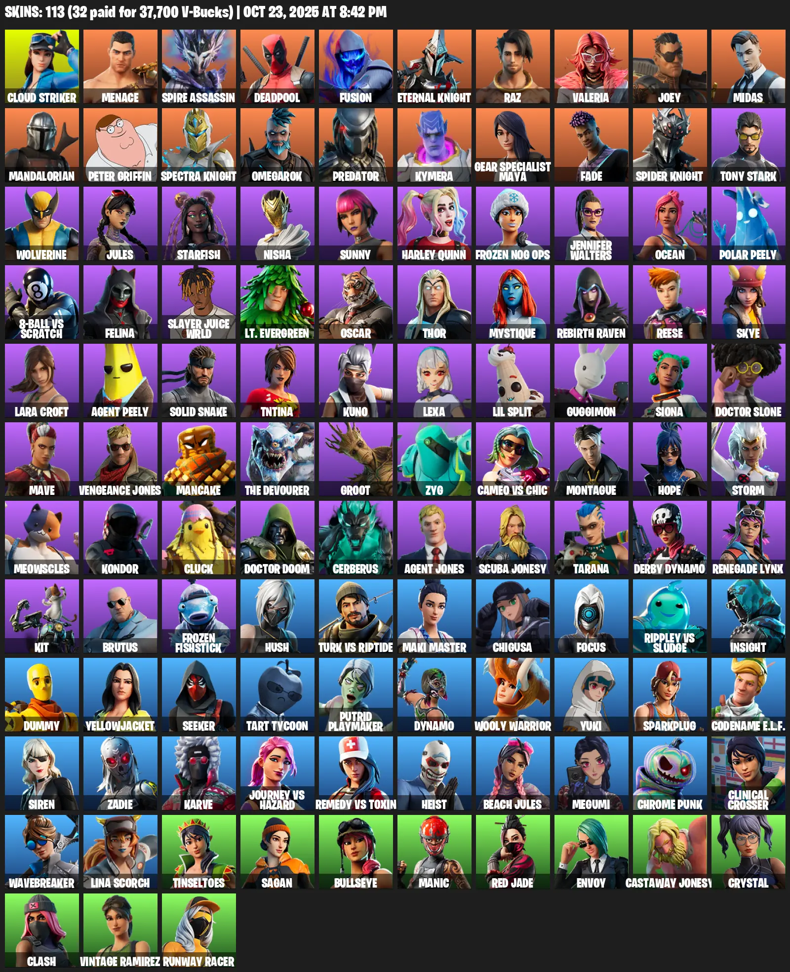 [PC/PSN/XBOX] | 113 skins | Leviathan Axe | Lara Croft | Cloud Striker | Menace | Spire Assassin | Deadpool | Fusion | #HQE7845 | #MBFN